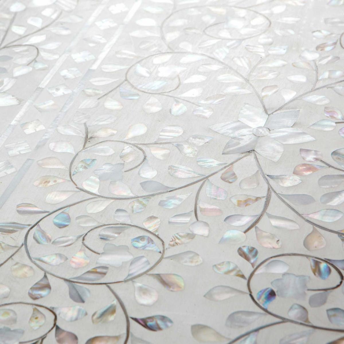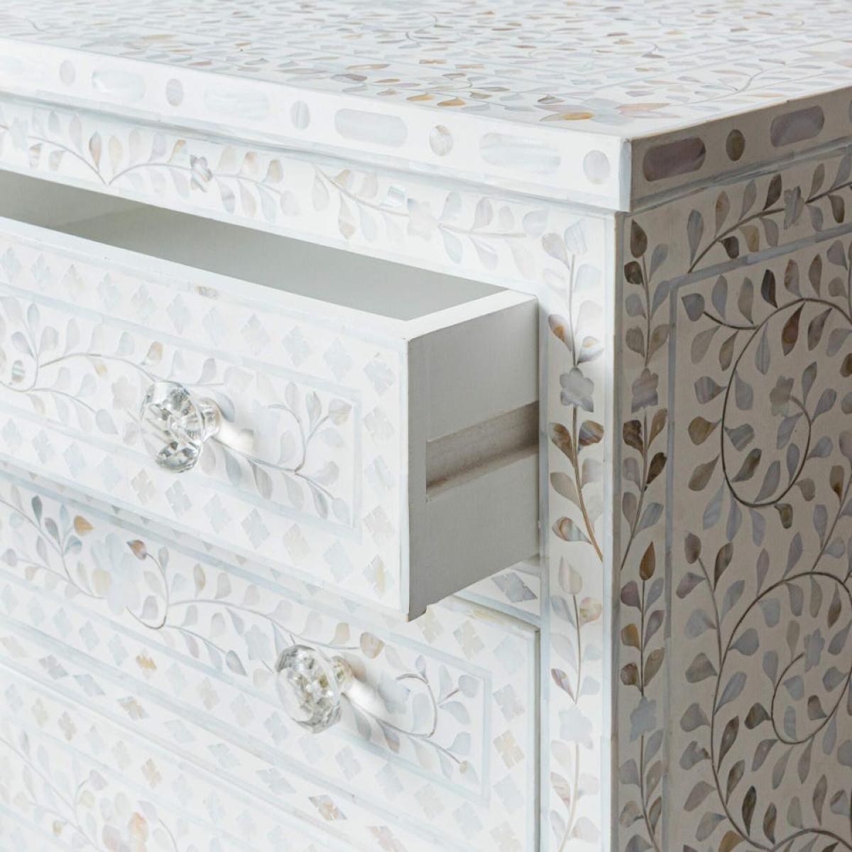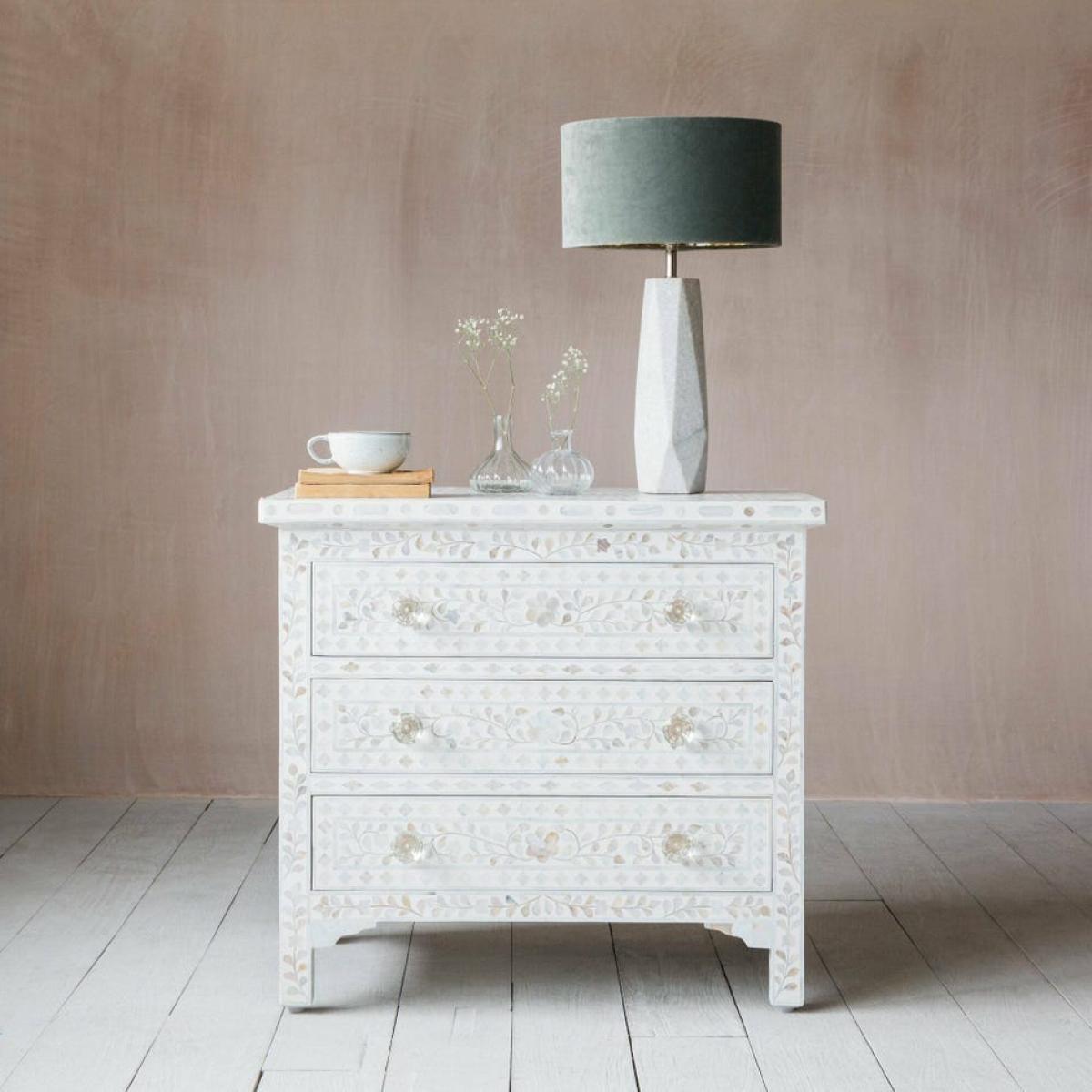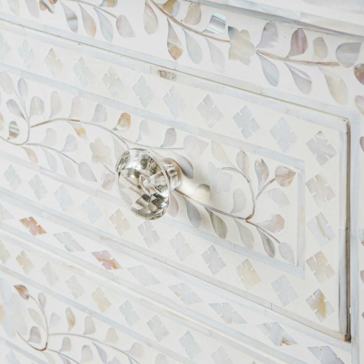 Our Classic White Mother of Pearl inlay large chest of drawers is exquisitely handcrafted in Jaipur by a team of skilled artisans, individual pieces of mother of pearl are hand-carved then fixed into brilliant white resin to create a beautiful floral design. Now in a larger size with three generous drawers to invite luxurious sanctuary in your bedroom.