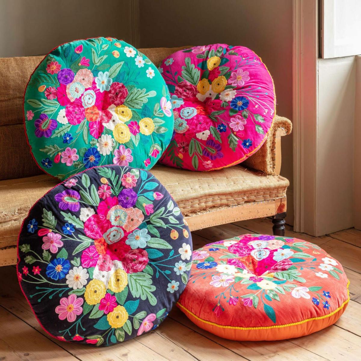 Adorned with an assortment of brightly coloured embroidered flowers on a jewel-toned background and finished with a contrasting pom pom trim. Each flower has been crafted by artisans on hand-driven machines that can take up to ten years to master. It's that human touch which means each cushion will be slightly different and unique. Diameter: 75cm. Made from a 100% cotton outer with a polyester fibre filling. Embroidered on hand-driven machines, so each design may be slightly different. Spot clean only, covers not removeable.