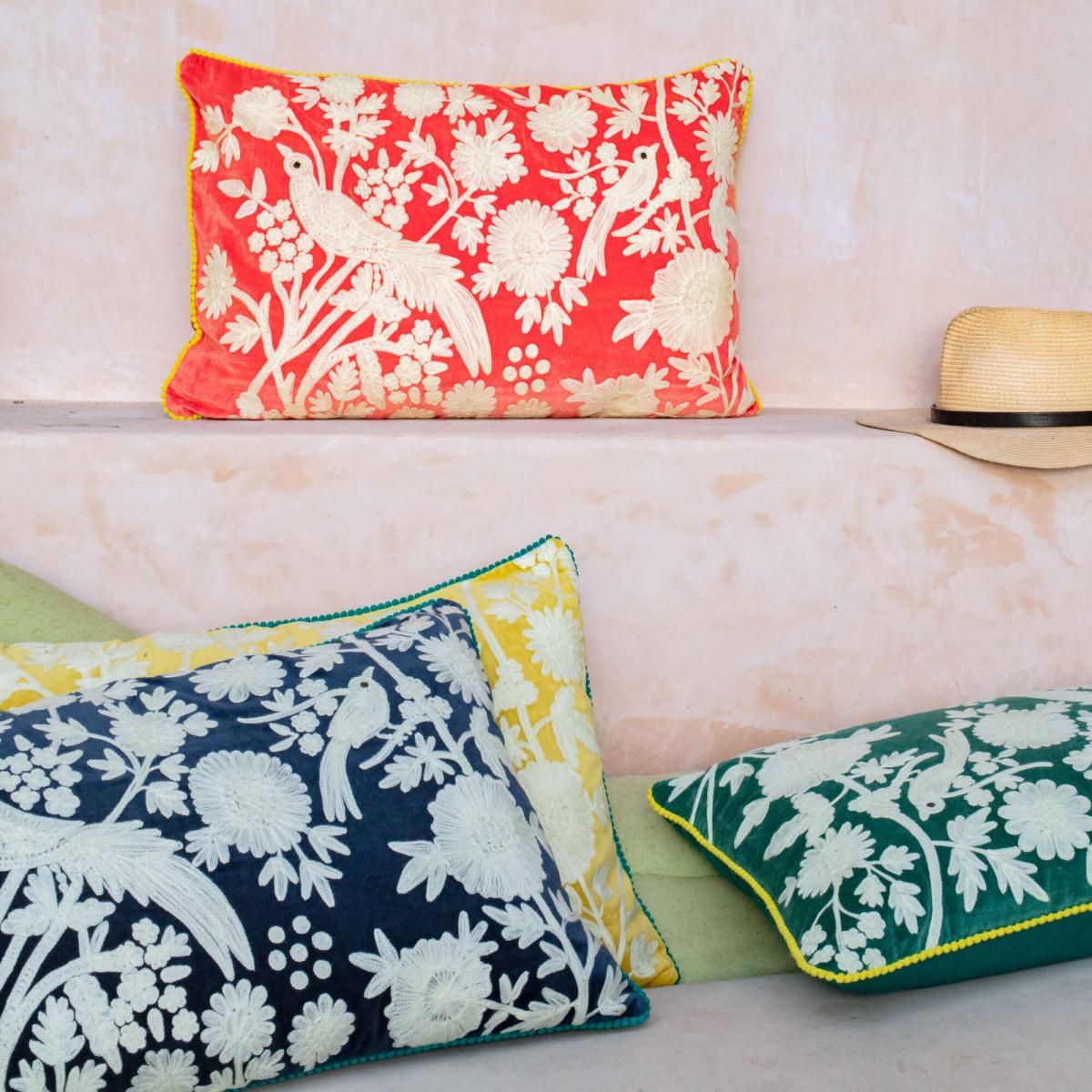 A collection of maximalist rectangular-shaped cushions in opulent jewel-toned velvet. Each one is handmade with an embroidered floral pattern twirling aroud a bird and trimmed with a contrasting colour pom pom border. Collect them all for your home. H40 x W60cm. Made from 100% cotton velvet. Remove spills immediately by blotting with a dry cloth. Professional cleaning is recommended. This product is handmade so the size, colour, and finish will vary.
