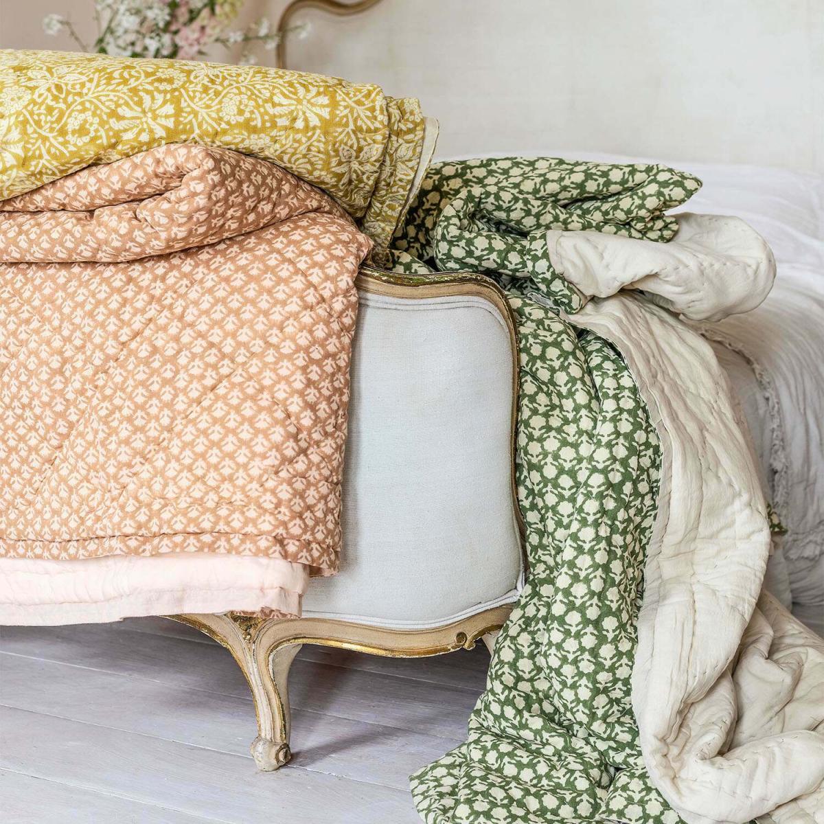 These king sized bed quilts have had their floral designs block printed using traditional techniques where the design is carved into a wooden block before the repeat pattern is printed by hand. Each quilt has been filled with a cosy cotton inner and finished with a diamond quilted pattern.