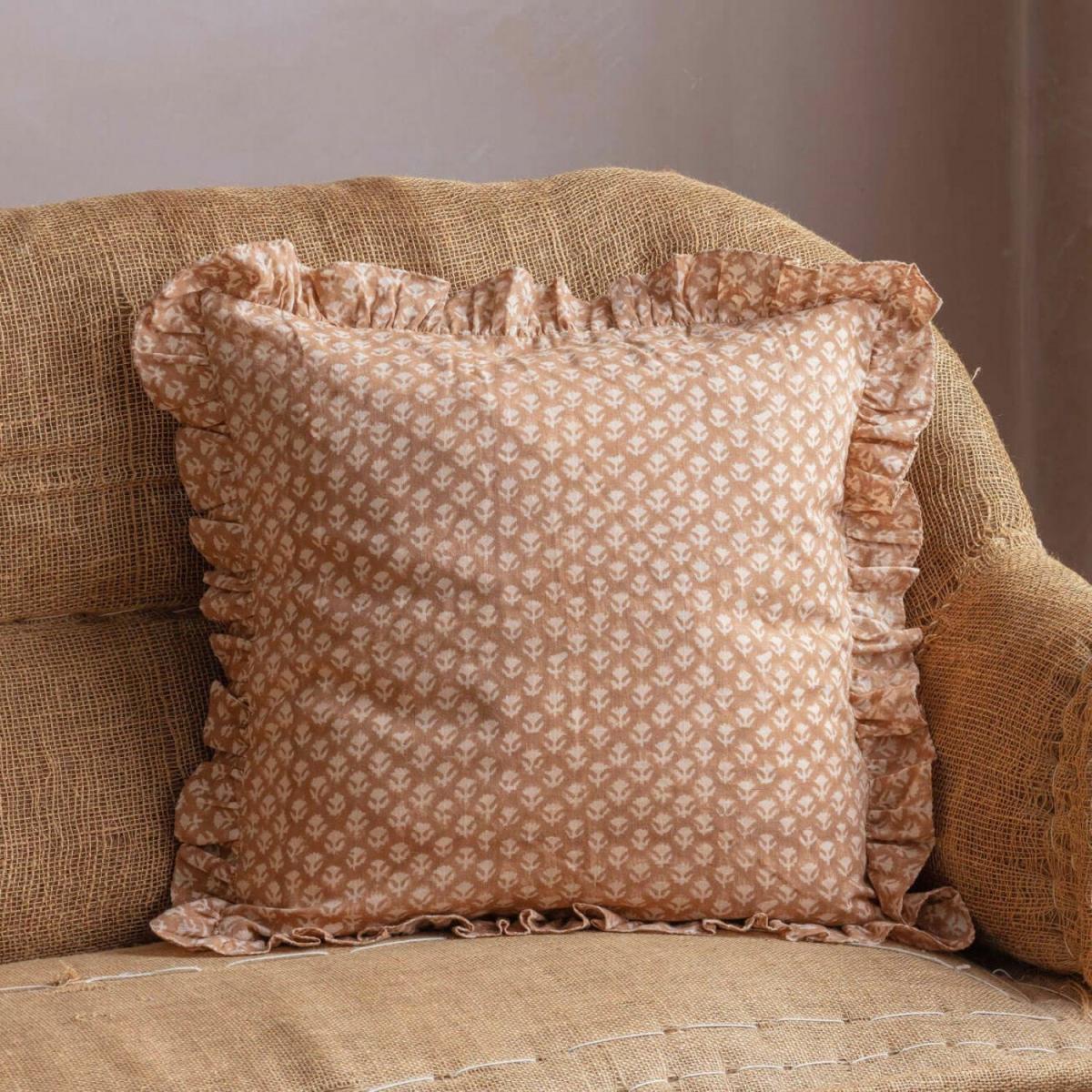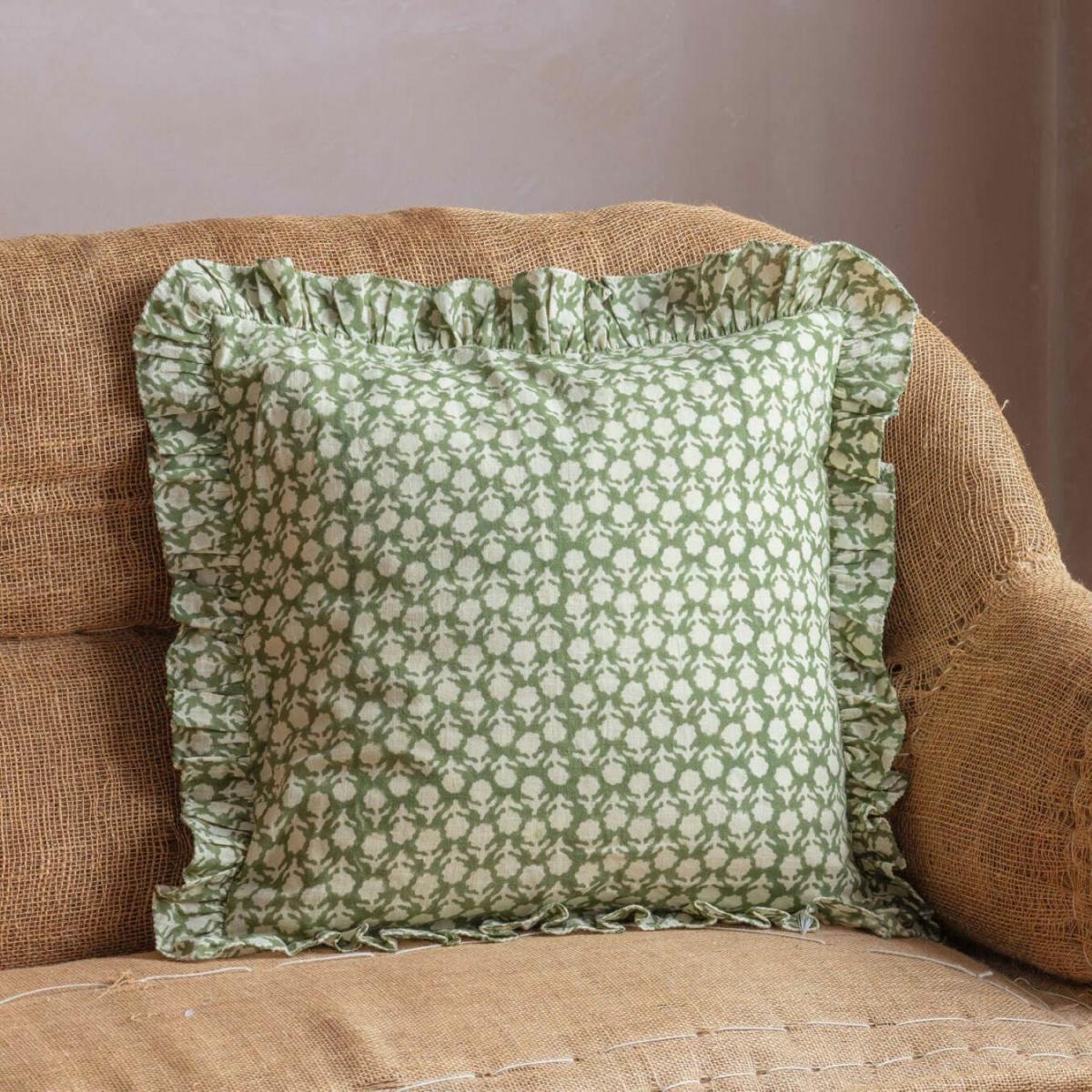 These square cushions have had their floral designs block printed using traditional techniques where the design is carved into a wooden block before the repeat pattern is printed by hand. Each cushion is filled with a feather inner and finished with a delicate matching frill edge.