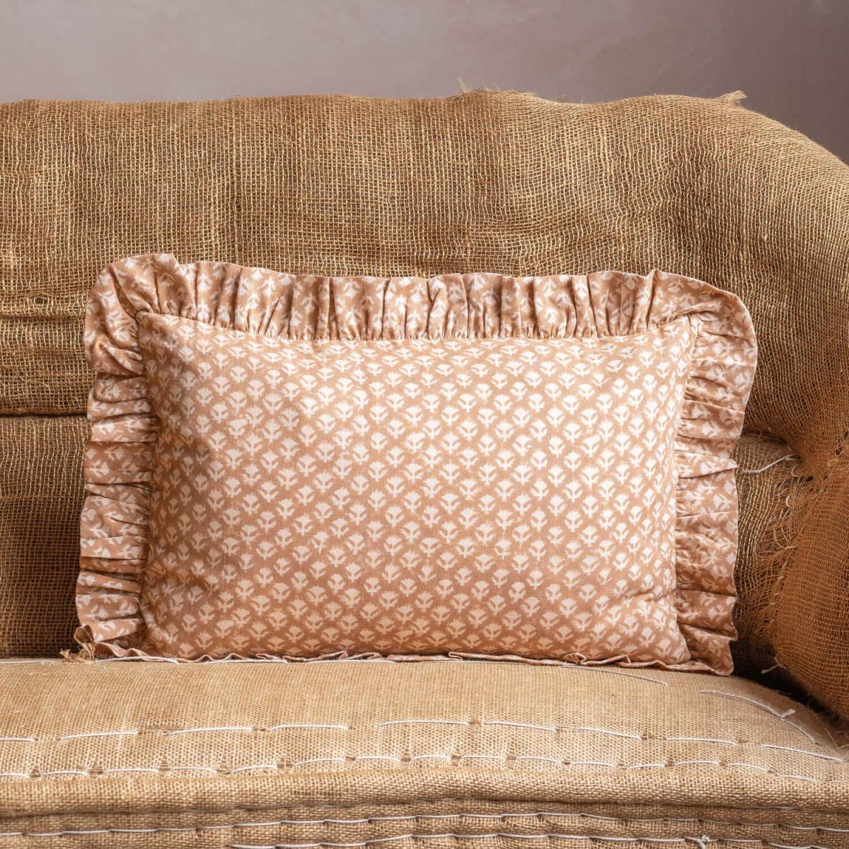 These small rectangular cushions have had their floral designs block printed using traditional techniques where the design is carved into a wooden block before the repeat pattern is printed by hand. Each cushion is filled with a feather inner and finished with a delicate matching frill edge.