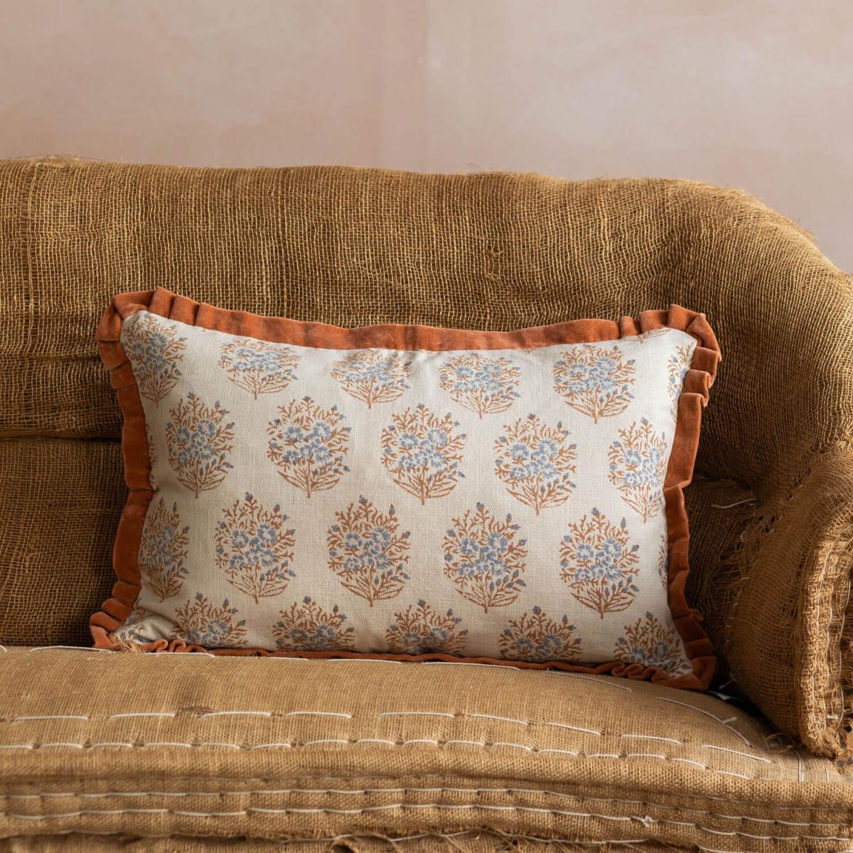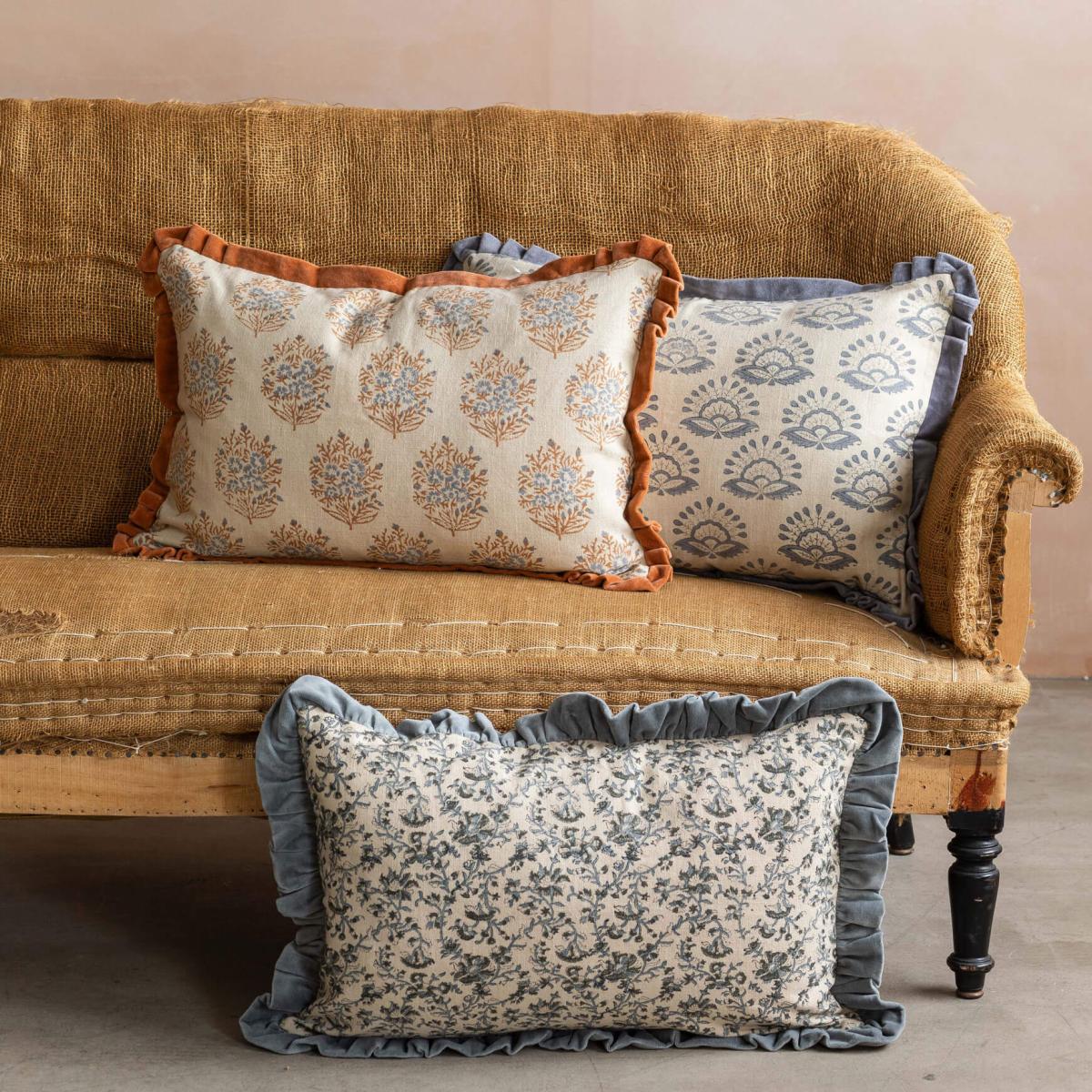 Expertly hand-block printed using traditional wooden blocks and soft cotton fabric, these large rectangular cushions feature delicate floral motifs and are finished with a coordinating velvet trim. Complete with a feather-filled inner, they make an elegant finishing touch for a sofa or armchair.