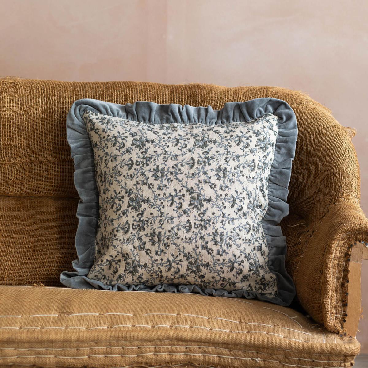 Expertly hand-block printed using traditional wooden blocks and soft cotton fabric, these square cushions feature delicate floral motifs and are finished with a coordinating velvet trim. Complete with a feather-filled inner, they make an elegant finishing touch for a sofa or armchair.