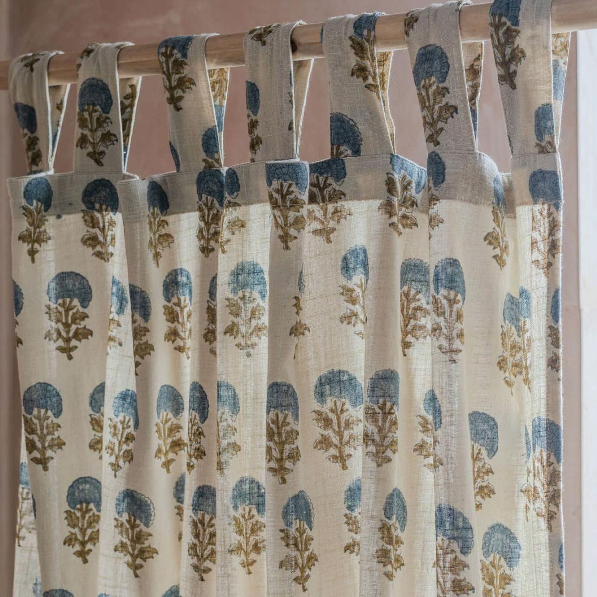 Traditional printing techniques have been used to create the antiqued floral patterns in these curtains. Each flowing curtain has been made in Jaipur from a light, cotton fabric, making them ideal for filtering out light or layering for a more dense coverage. Curtains are sold individually.