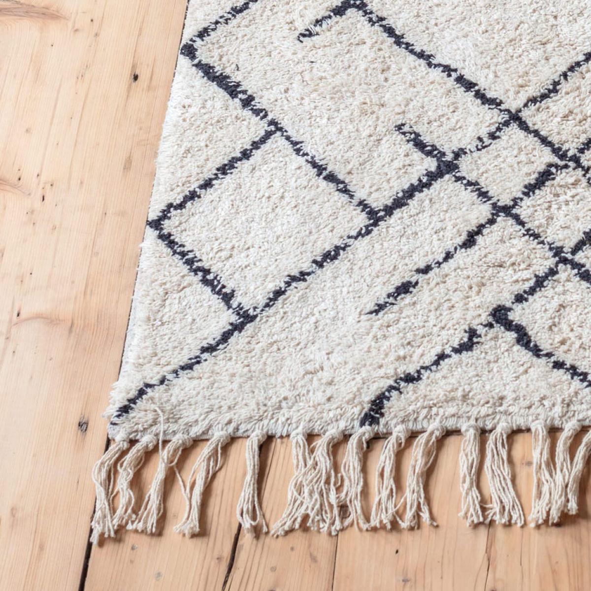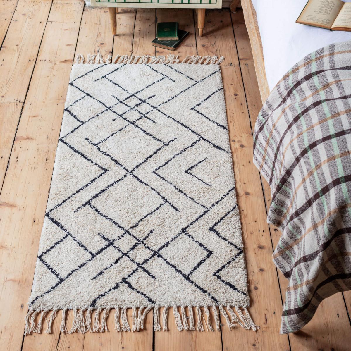 An ivory cotton runner with fringed detailing and printed with a pared-back geometric design that will add texture and pattern to an entrance or hallway.