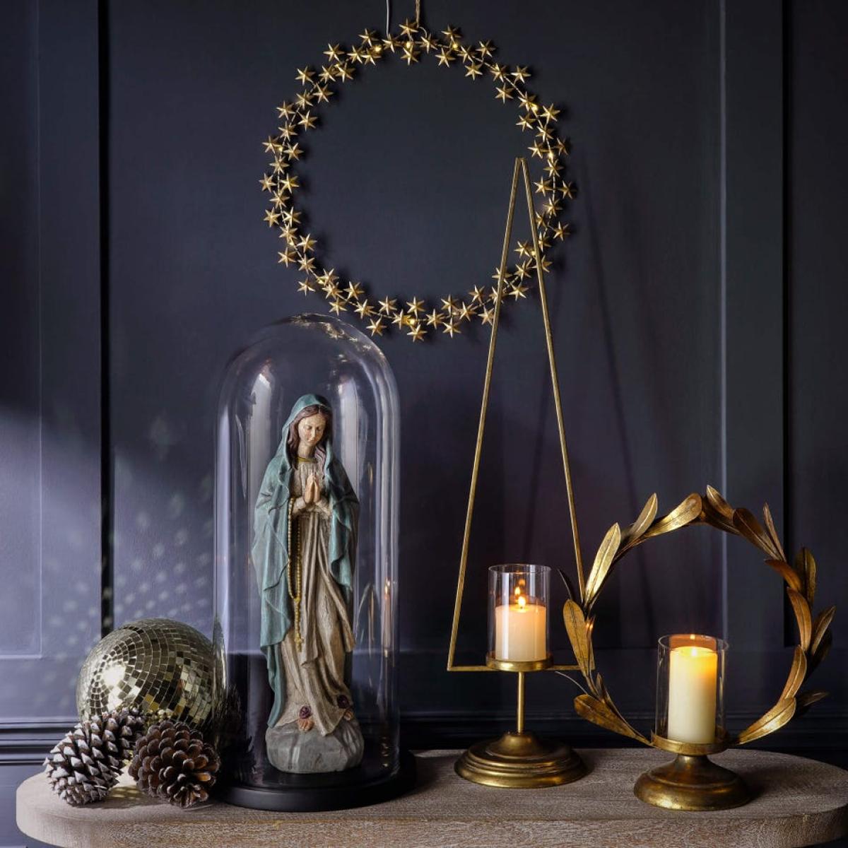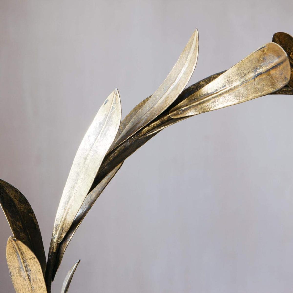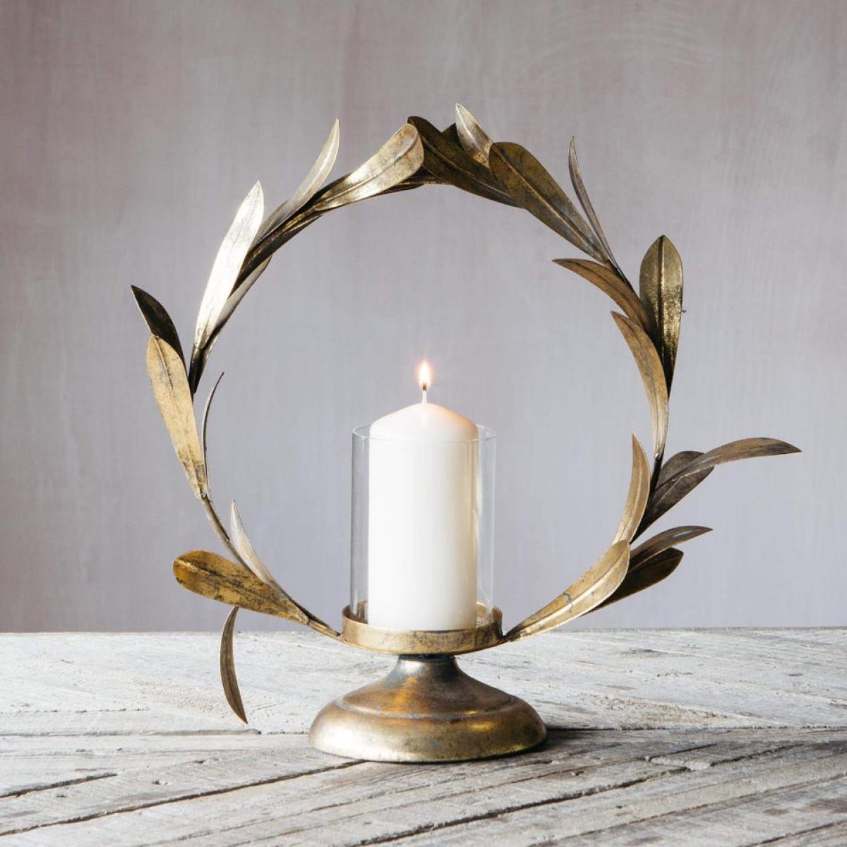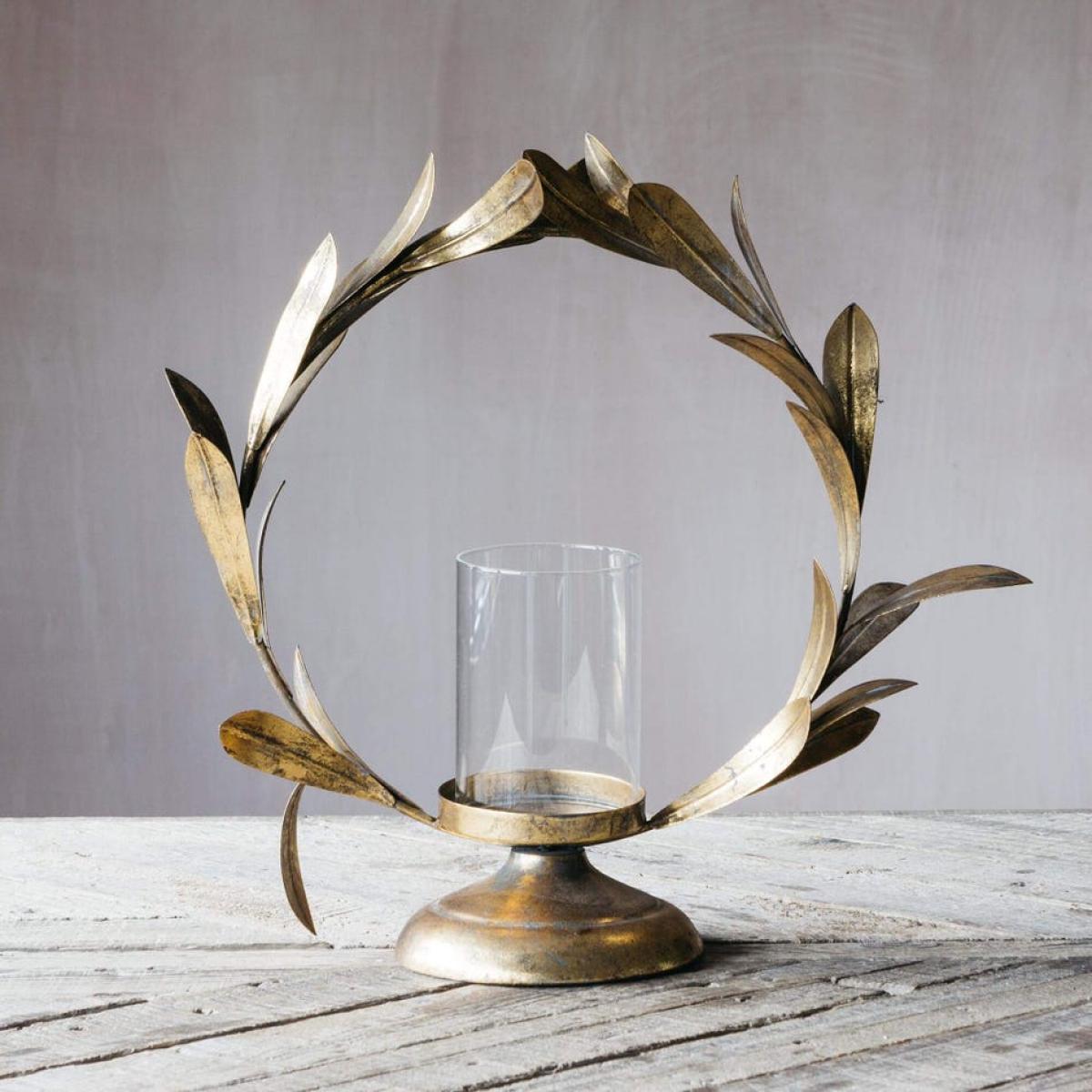 A small glass votive surrounded by a loop of gold laurel leaves for adding a touch of candlelit grandeur to your home. H40. 5 x W38 x D15cm. Made of glass and iron with a gold finish. The exact colour and finish will vary.