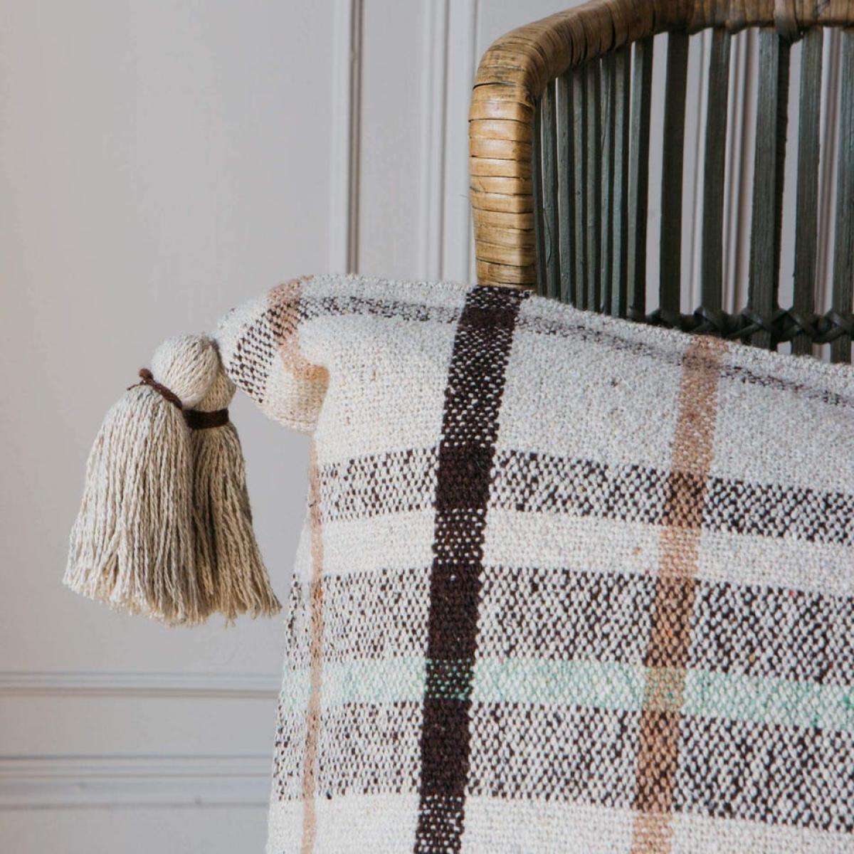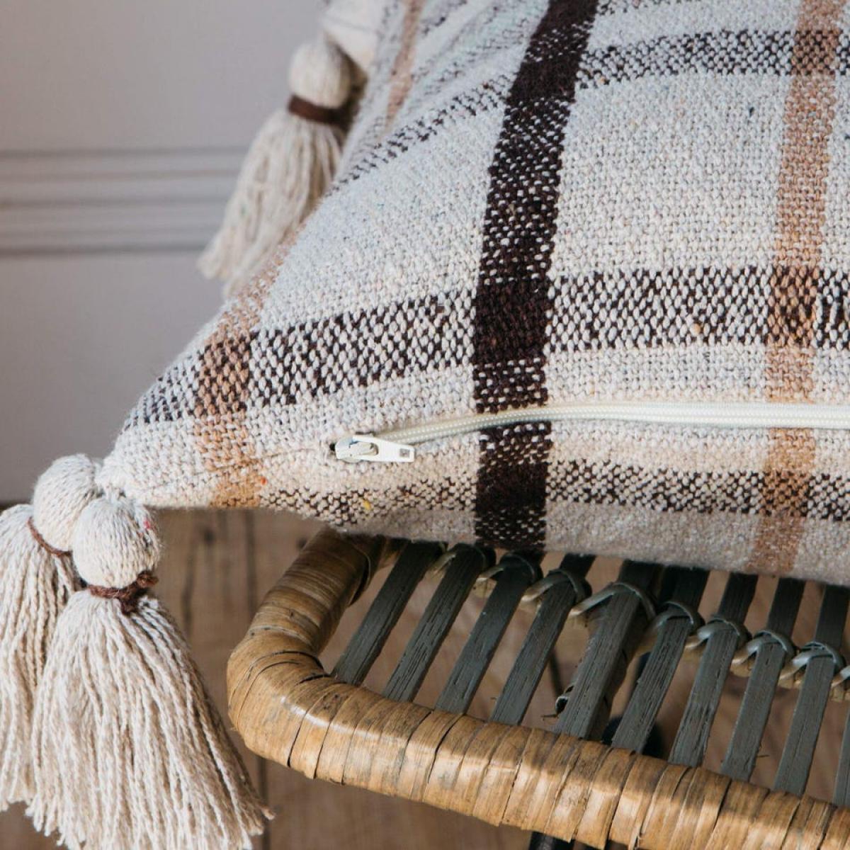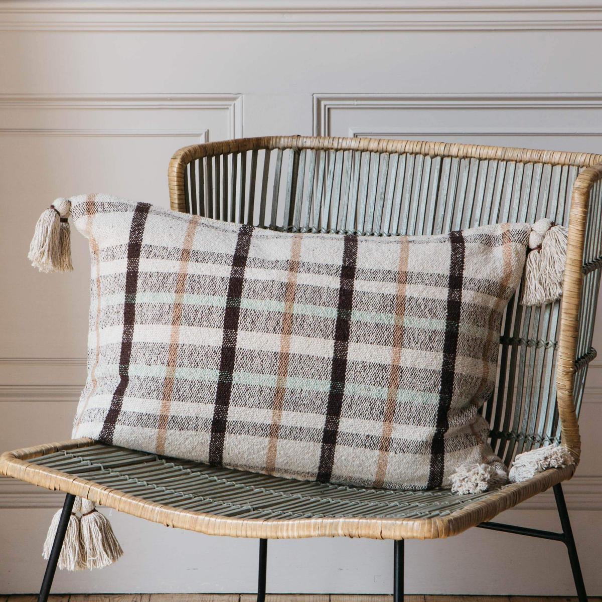 Repurposed from the clothing waste industry, this rectangular cushion is made from recycled cotton and features a traditional check print and finished with four plush tassels. Perfect for your country cabin.