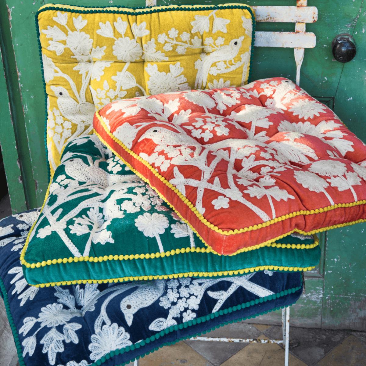 A collection of maximalist seat pads in opulent jewel-toned velvet. Each one is embroidered with a floral bird pattern and trimmed with a contrasting pom pom border to add a dash of colour to your dining chairs. H3 x L40 x W40cm. Made from 100% cotton velvet. Polyfiber filling. Remove spills immediately by blotting with a dry cloth. Professional cleaning is recommended. This product is handmade so the size, colour, and finish will vary.