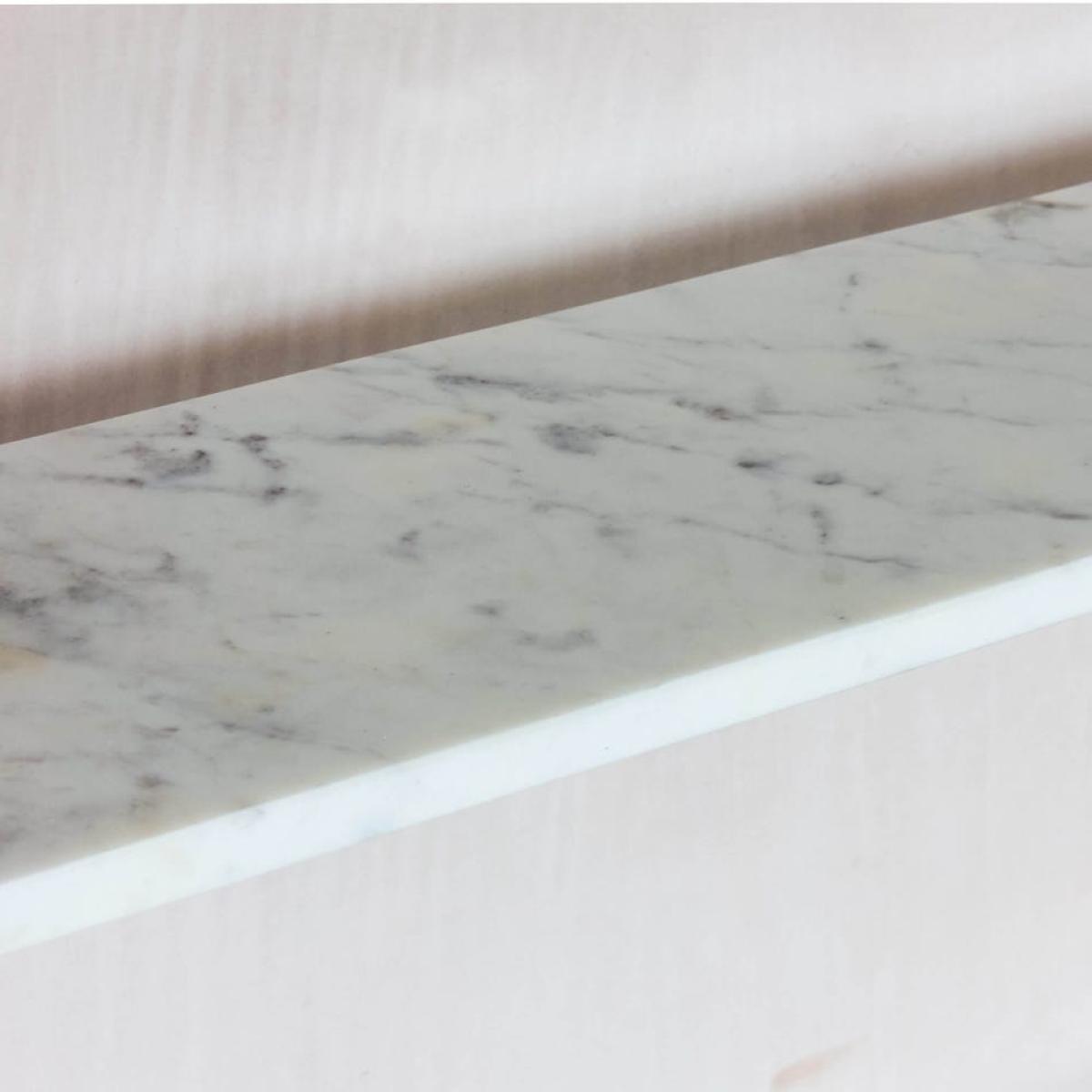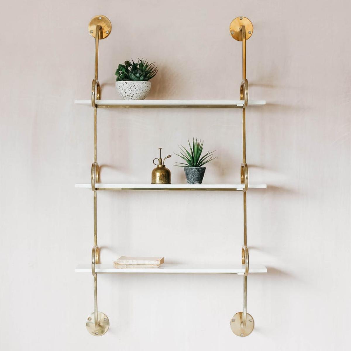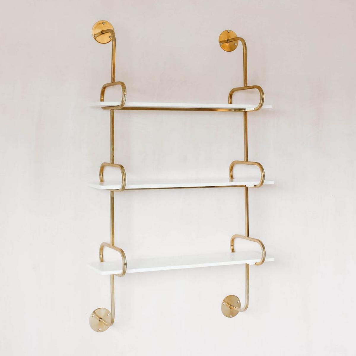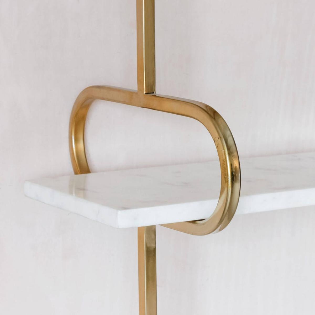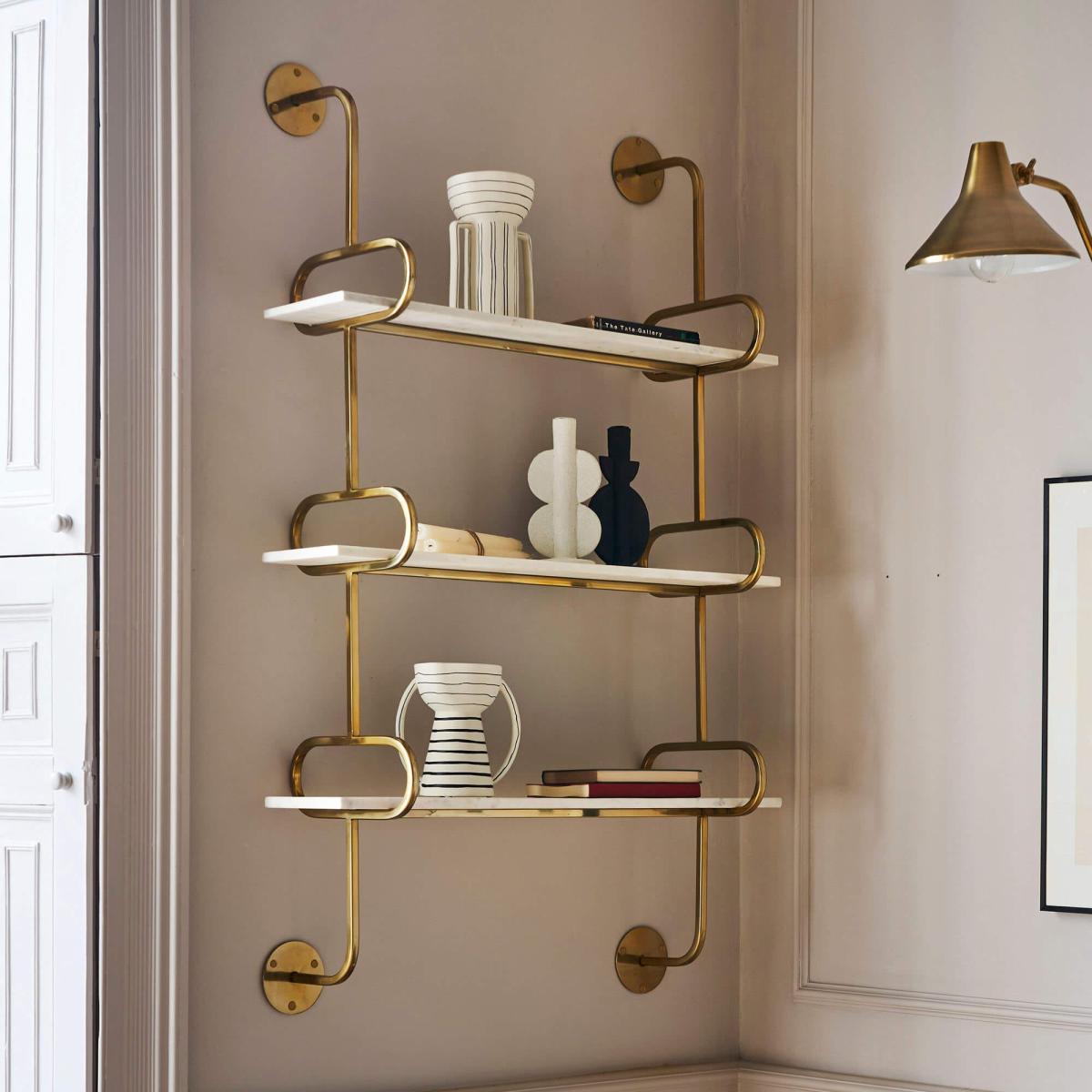 A luxurious shelving unit crafted from regal white marble in a golden frame, showcase your keepsakes and treasure on three tiers. H130 x W79 x D23cm. Shelves made of white marble. Frame made of stainless steel with a gold finish. Shelving frame is fixed into place and marble shelves slot into place. Fittings not included. Not bathroom suitable. Clean with a soft dry cloth. This product is made from natural materials so the size, colour, and finish will vary and will contain beautifully preserved mottling, veining and natural variation.