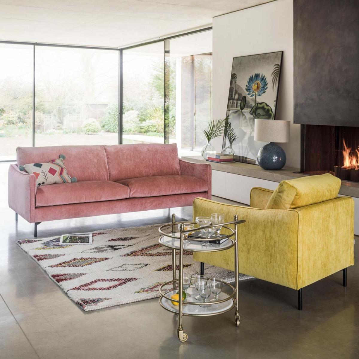 A clean and contemporary design that embraces both comfort and style. The elegant curved arms and slim black legs showcase modern design, while the sumptuously filled seat and back provide comfort; the perfect balance of style and support. Pictured: three seater sofa in Salmon Vintage Velvet and armchair in Mustard Vintage Velvet. Lead time 8-10 weeks. Please see our delivery information.