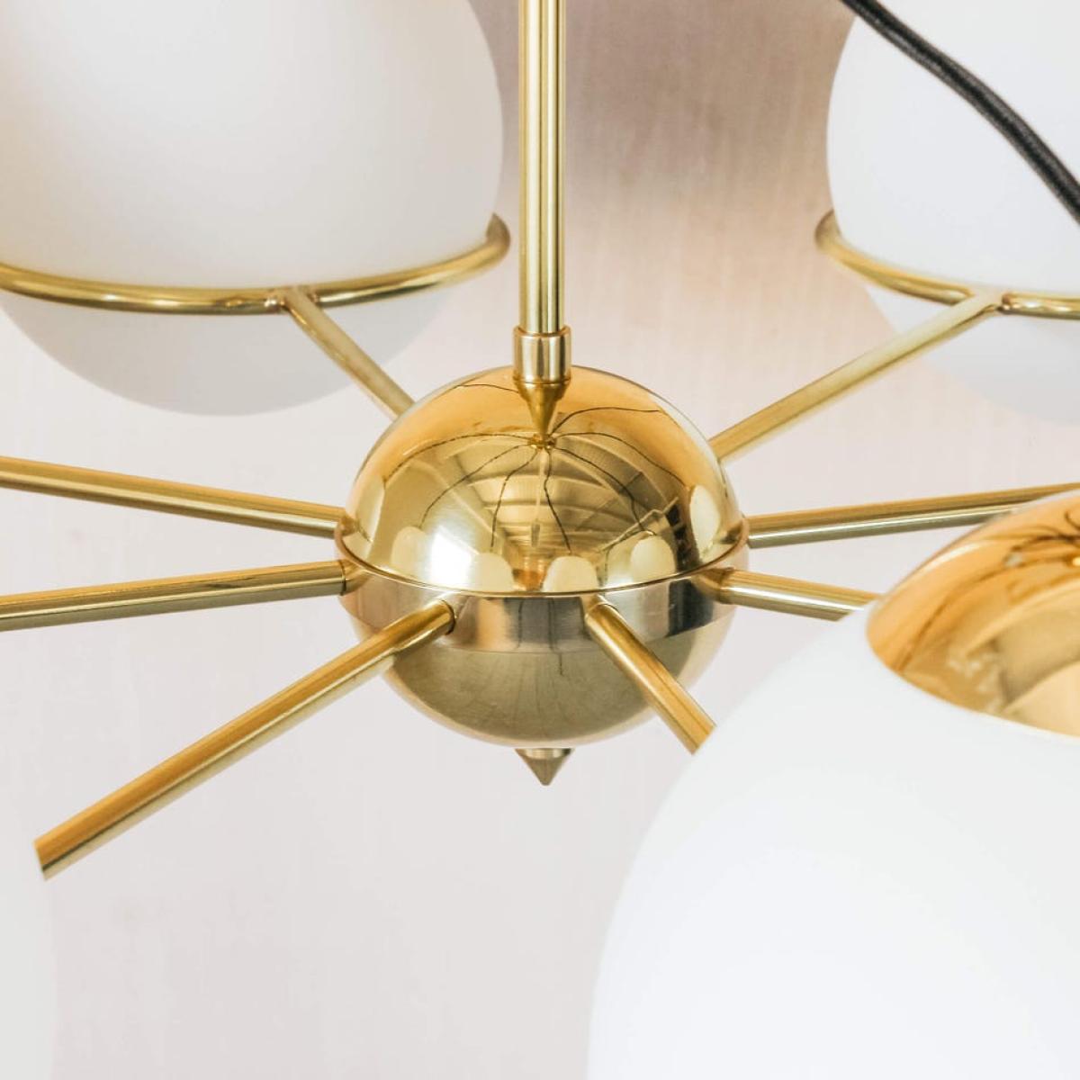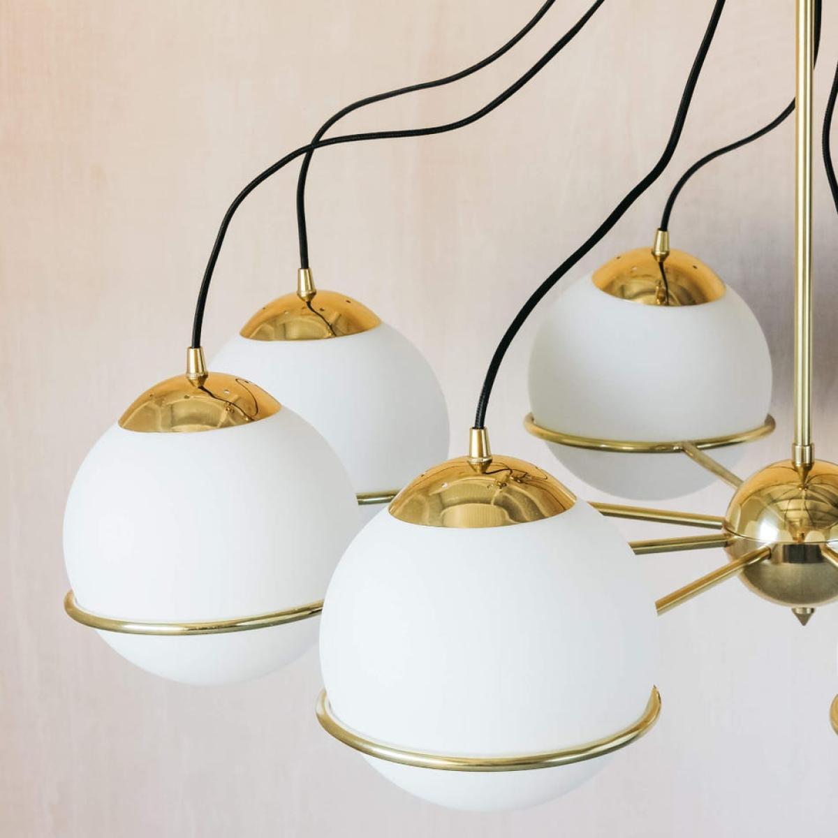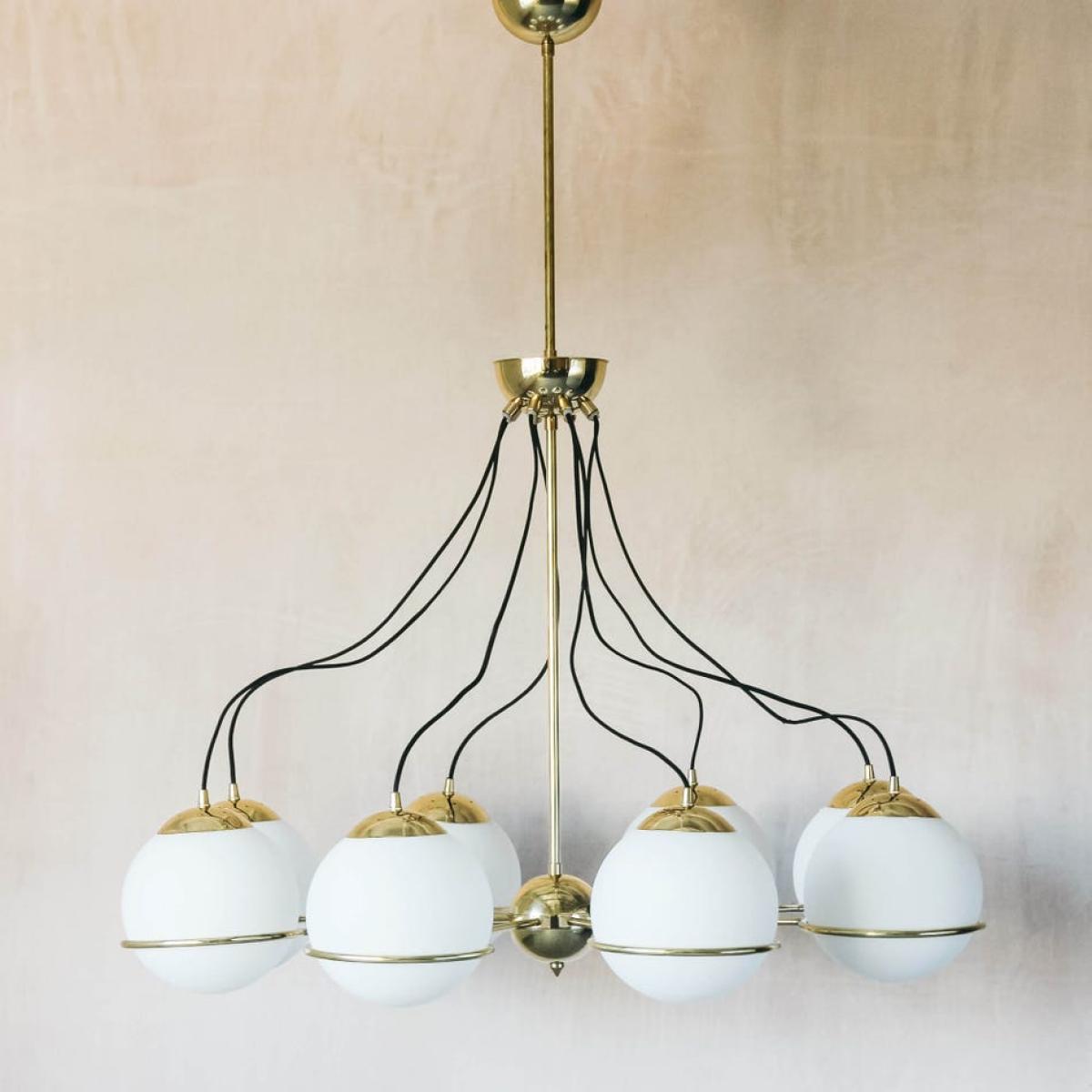 A decadent chandelier with white orbs perched on brass plated holders and a brass ceiling rose, perfectly suited for the magnificent mid-century home. H105 x W101 x D101cm. Requires 8 x E14 Max 25W (not included).Globes: Diameter 20cm | Ceiling rose: Diameter 13cm. Drop:L43cm (not adjustable).Weight: 7. 7kg. Made of brass and glass. We recommend consulting a qualified electrician for installation guidance.