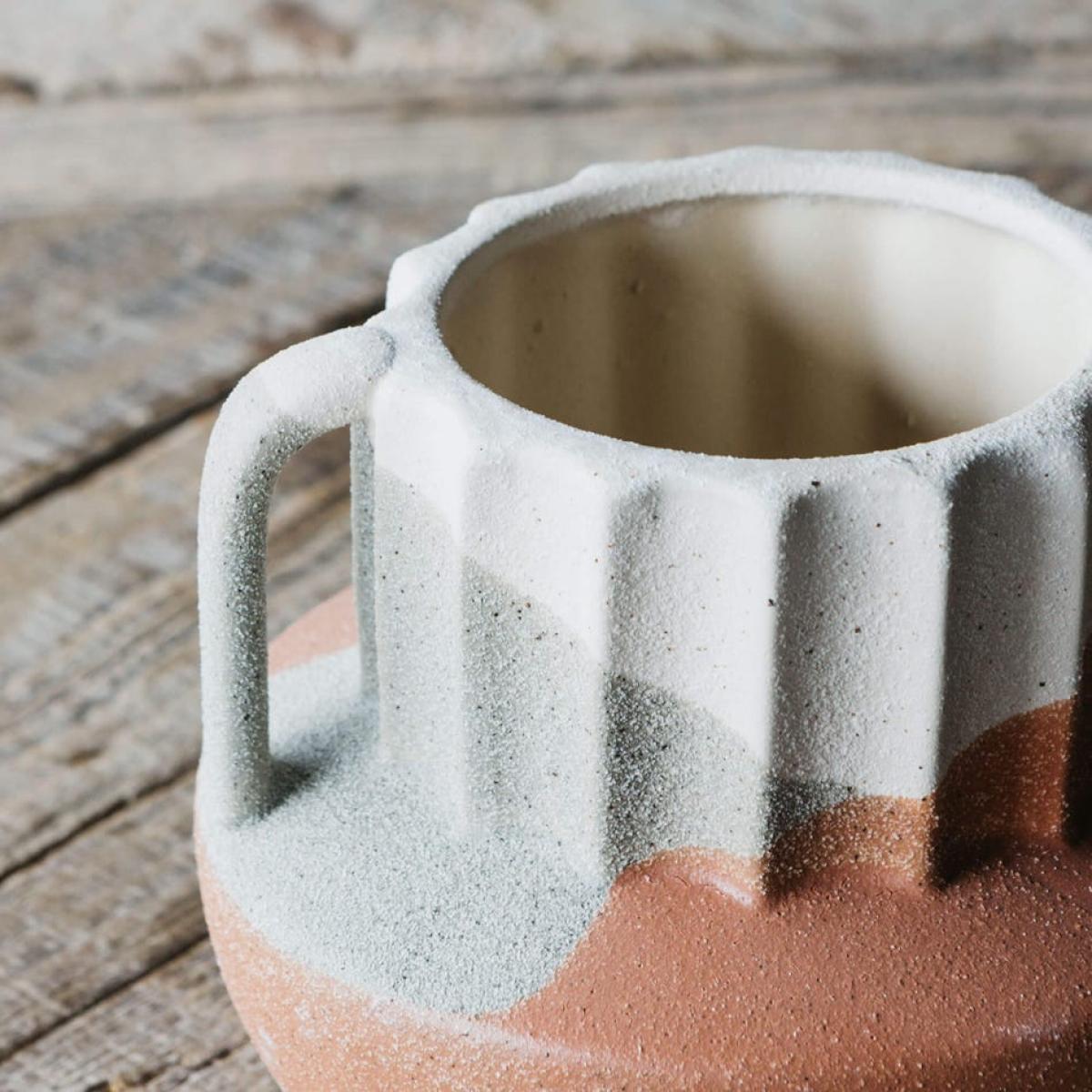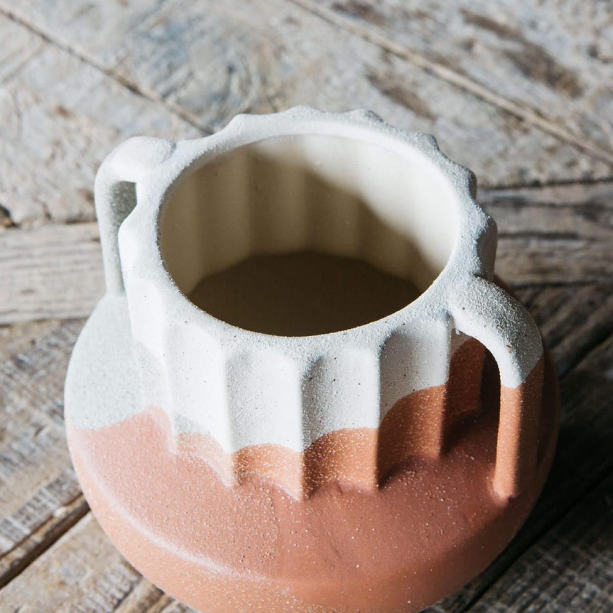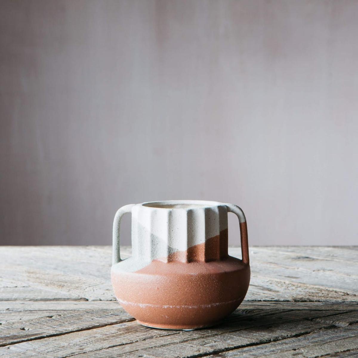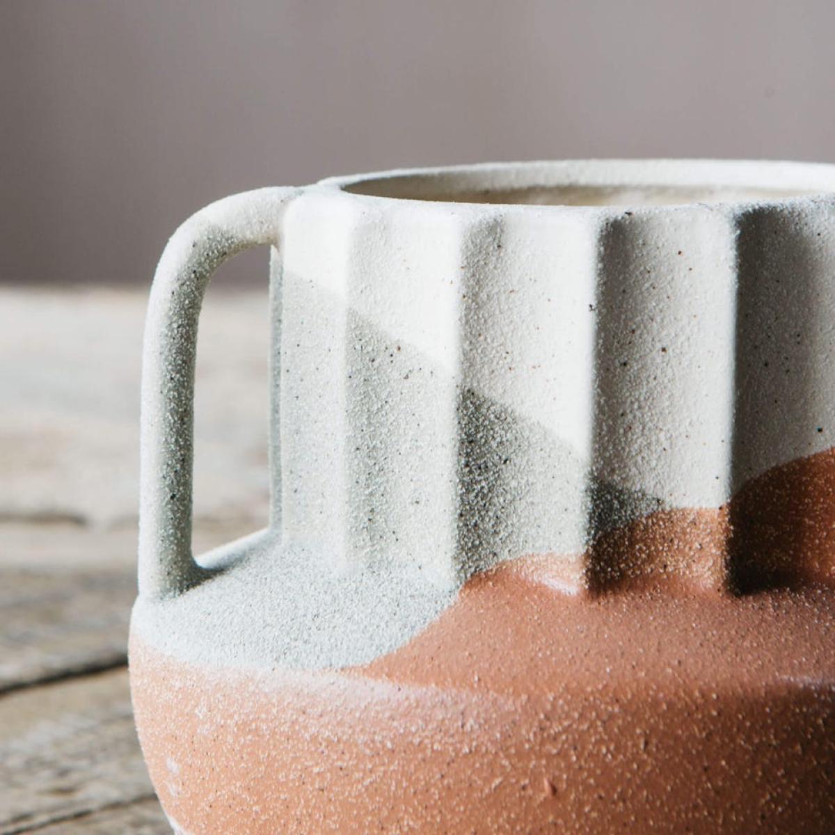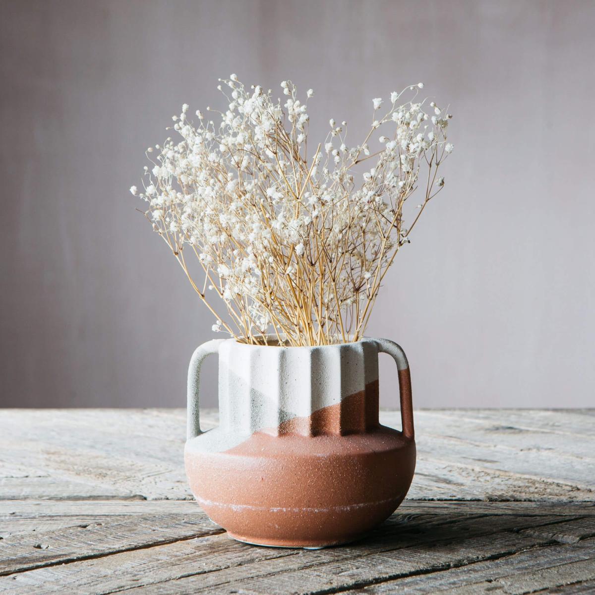 The Grecian urn has a modern update with overlapping terracotta and grey hues and a ribbed ivory top. Fill this stone vase with pampas grass or dried flowers in complementary hues. H14 x Diameter 14. 5cm. Made of ceramic. The exact colour and finish will vary. Not waterproof.