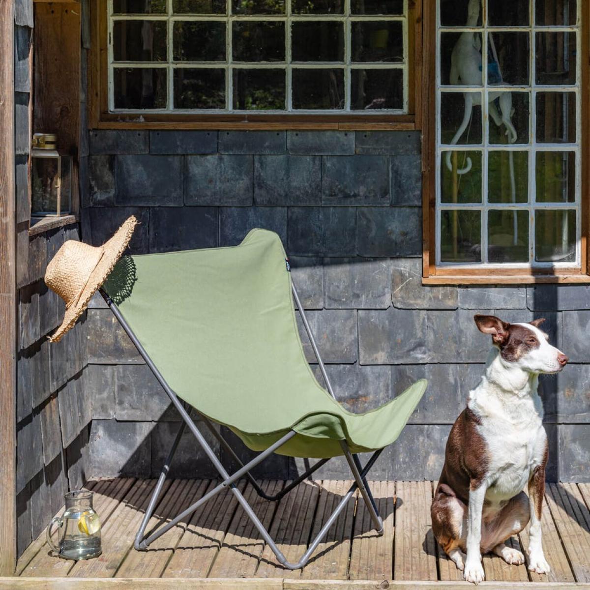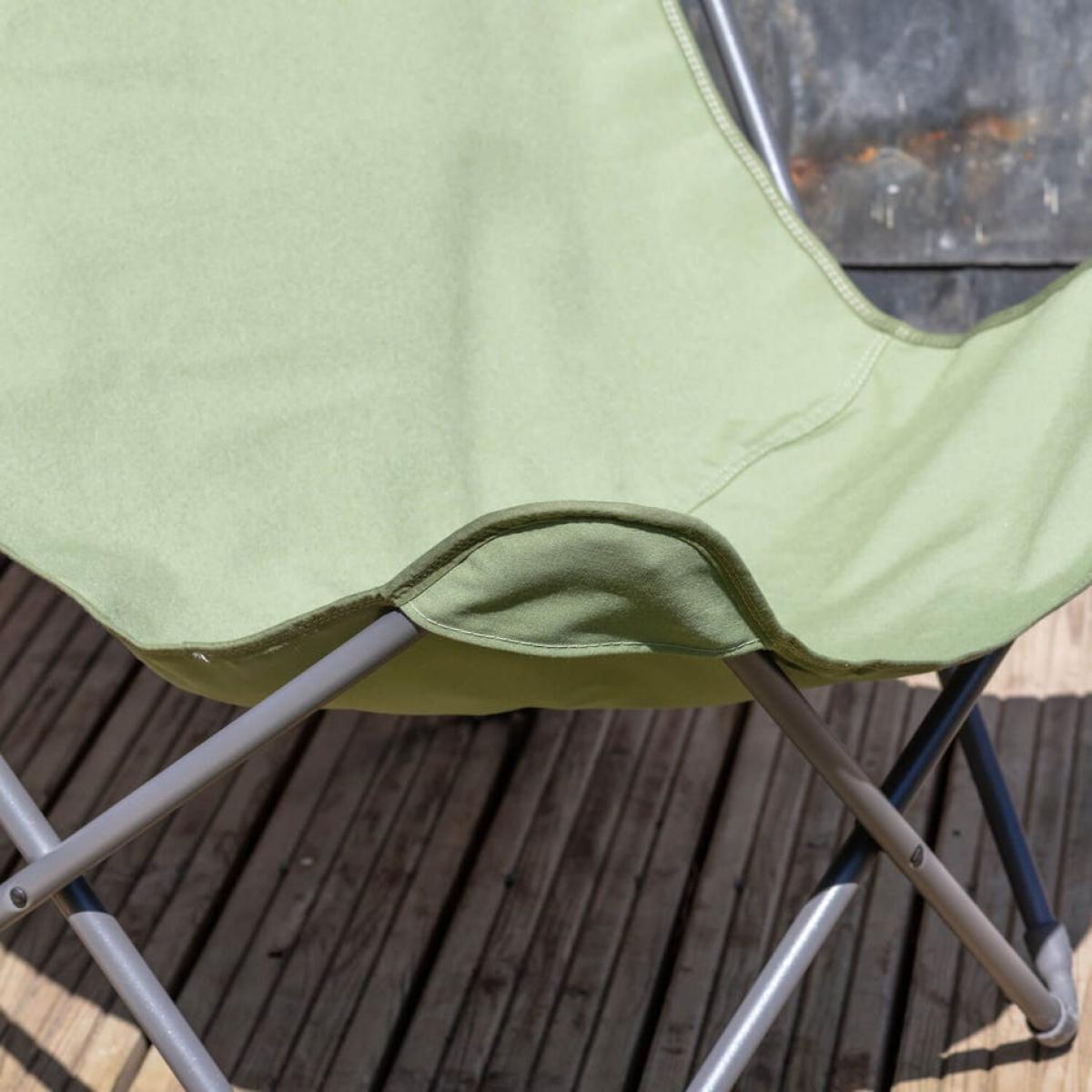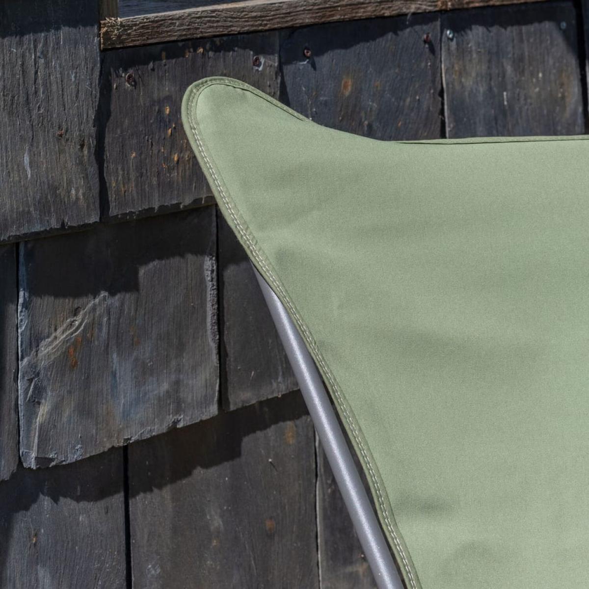 A fold-up butterfly chair designed for outdoor use with a khaki green polyester seat with excellent resistance to UV rays, a generously wide chair perfect for relaxing on the beach.