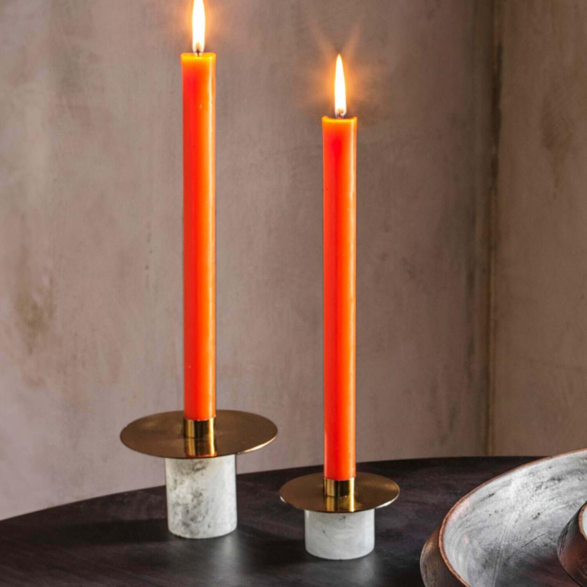 Crafted from natural alabaster stone and smooth stainless steel with a brass-coloured finish, these candle holders will bring luxurious elegance to your dining area when paired with a standard-sized dinner candle. Small (ASB1022): H6m x Diameter 9cm. Large (ASB1023): H9cm x Diameter 12cm. Crafted from natural alabaster and stainless steel. Fits a standard-sized dinner candle. Variations in the alabaster's finish are to be expected and celebrated as part of this natural material.