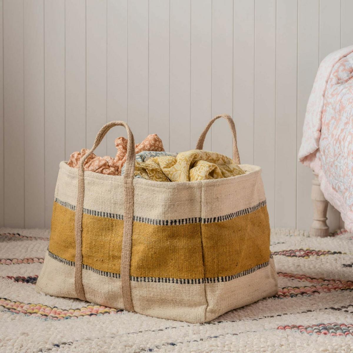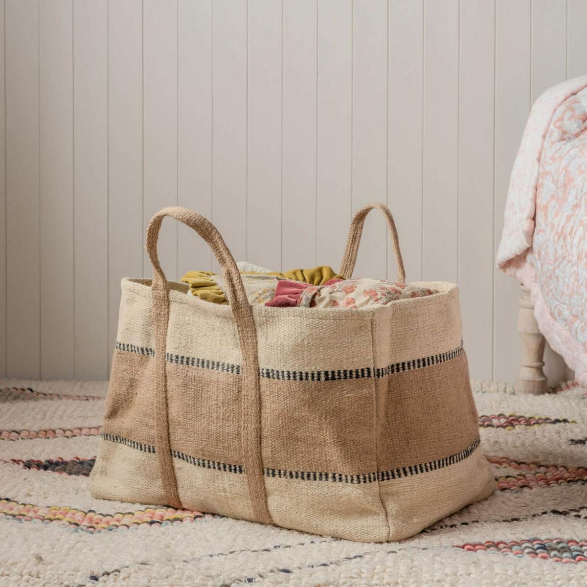 These spacious storage baskets are hand-woven from thick jute yarn with bold striped patterns. Perfect for storing cushions, throws, or soft toys, they feature two sturdy handles for easy movement around your home. Ideal for a sitting room or child’s bedroom, they combine style with practicality.