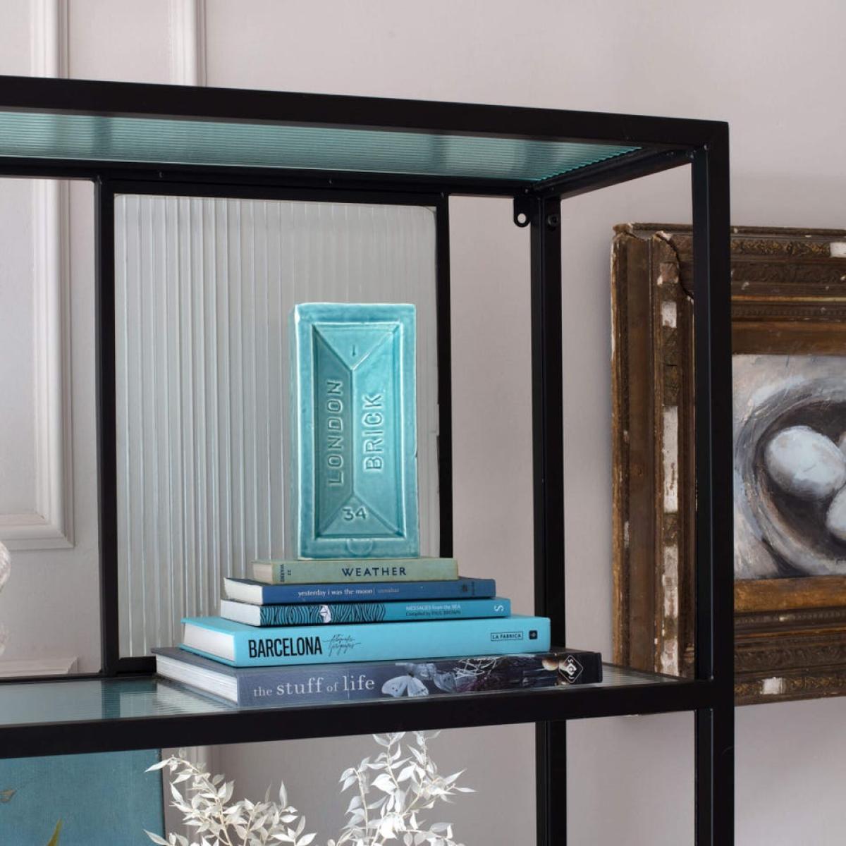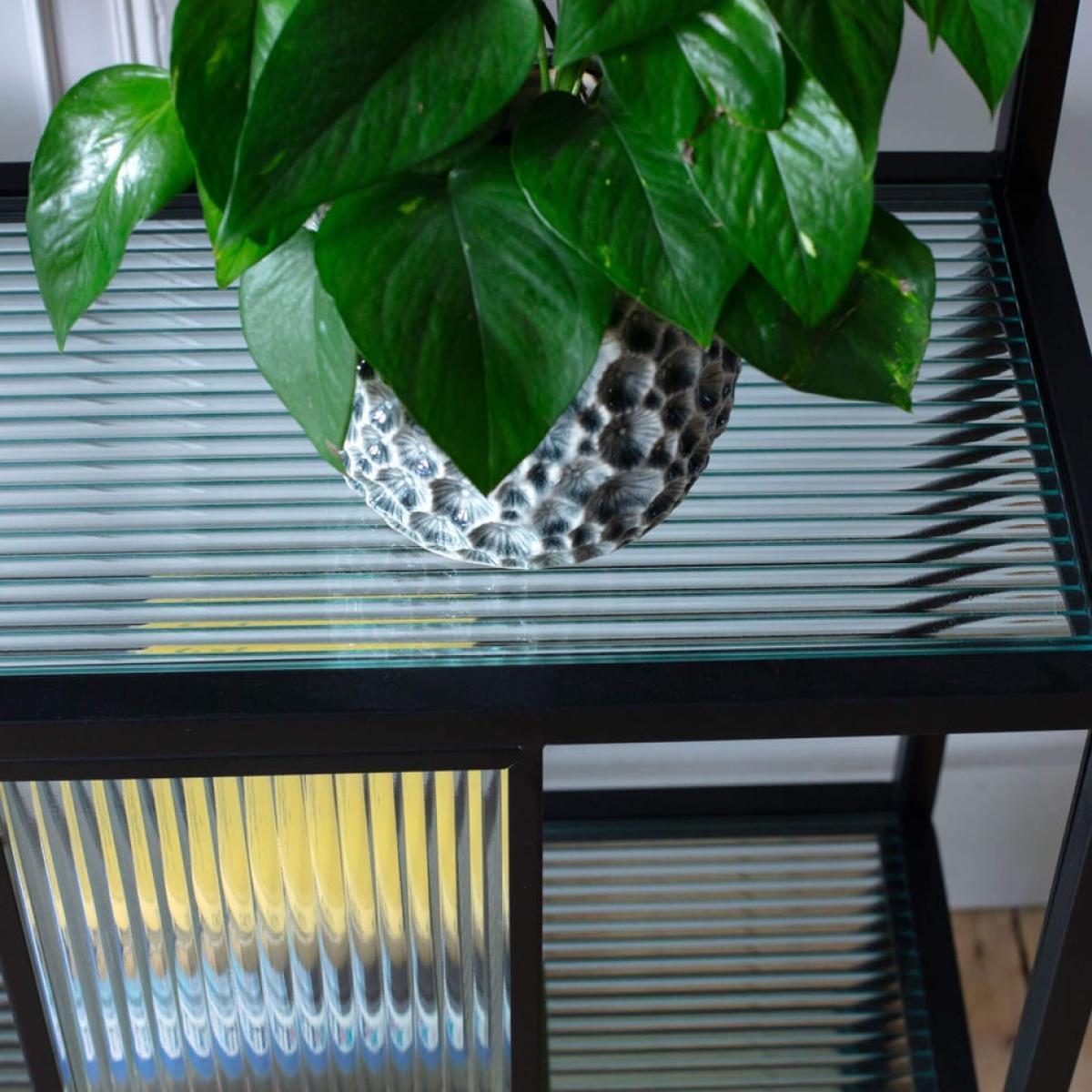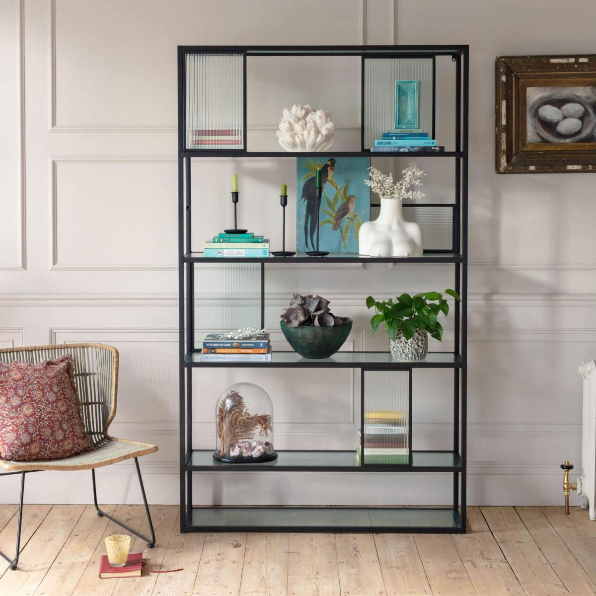 With a Bauhaus-inspired silhouette, this bookcase is crafted from powder-coated steel and features ribbed glass detailing on five generous shelves for displaying a rainbow of coloured glassware or your favourite reads.