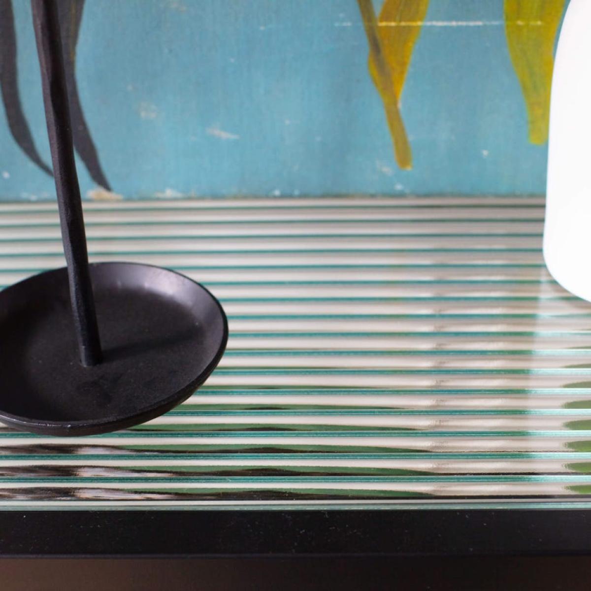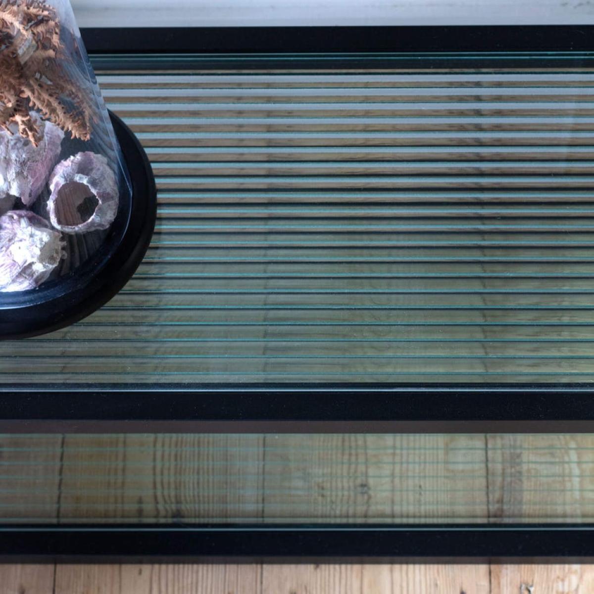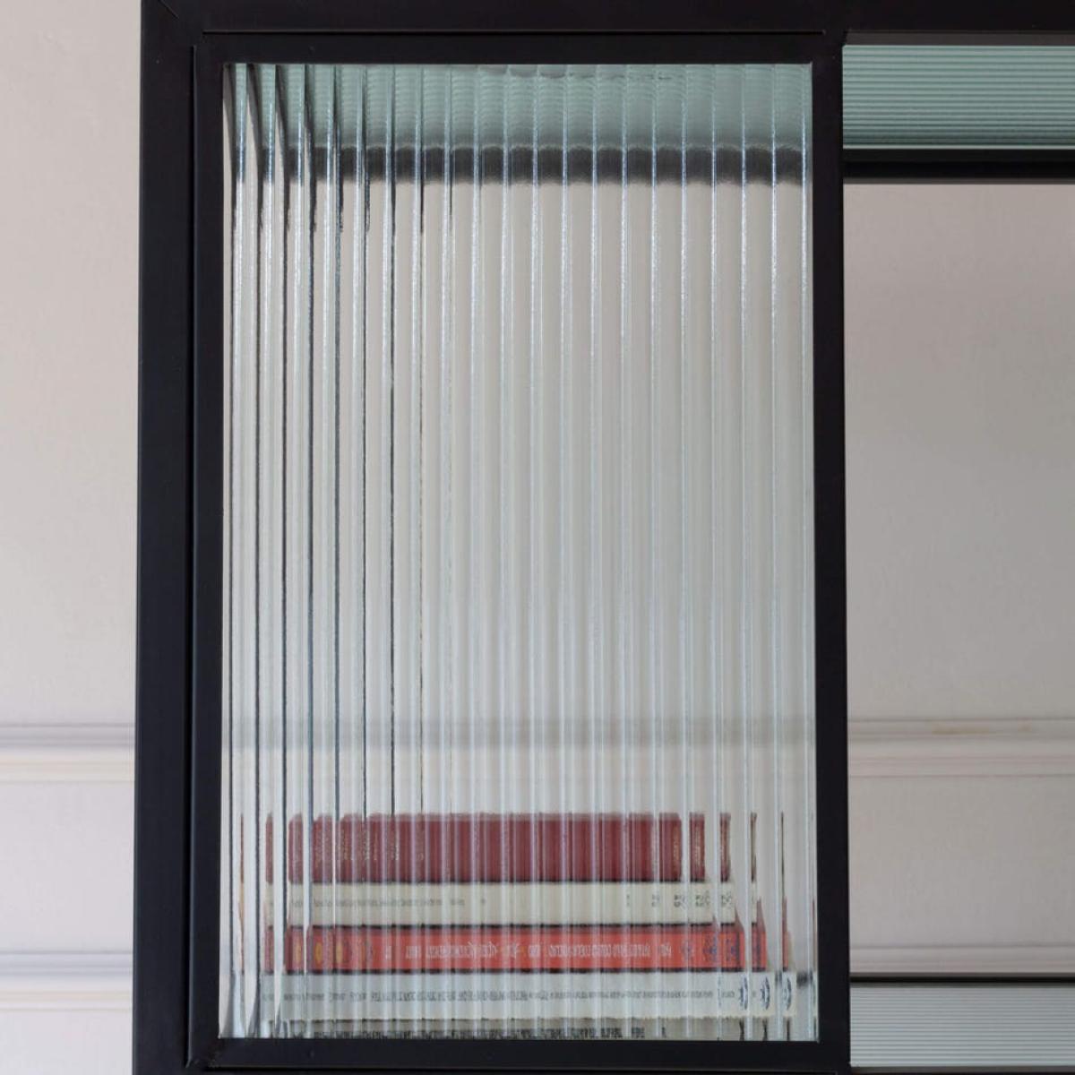 With a Bauhaus-inspired silhouette, this bookcase is crafted from powder-coated steel and features ribbed glass detailing on five generous shelves for displaying a rainbow of coloured glassware or your favourite reads.