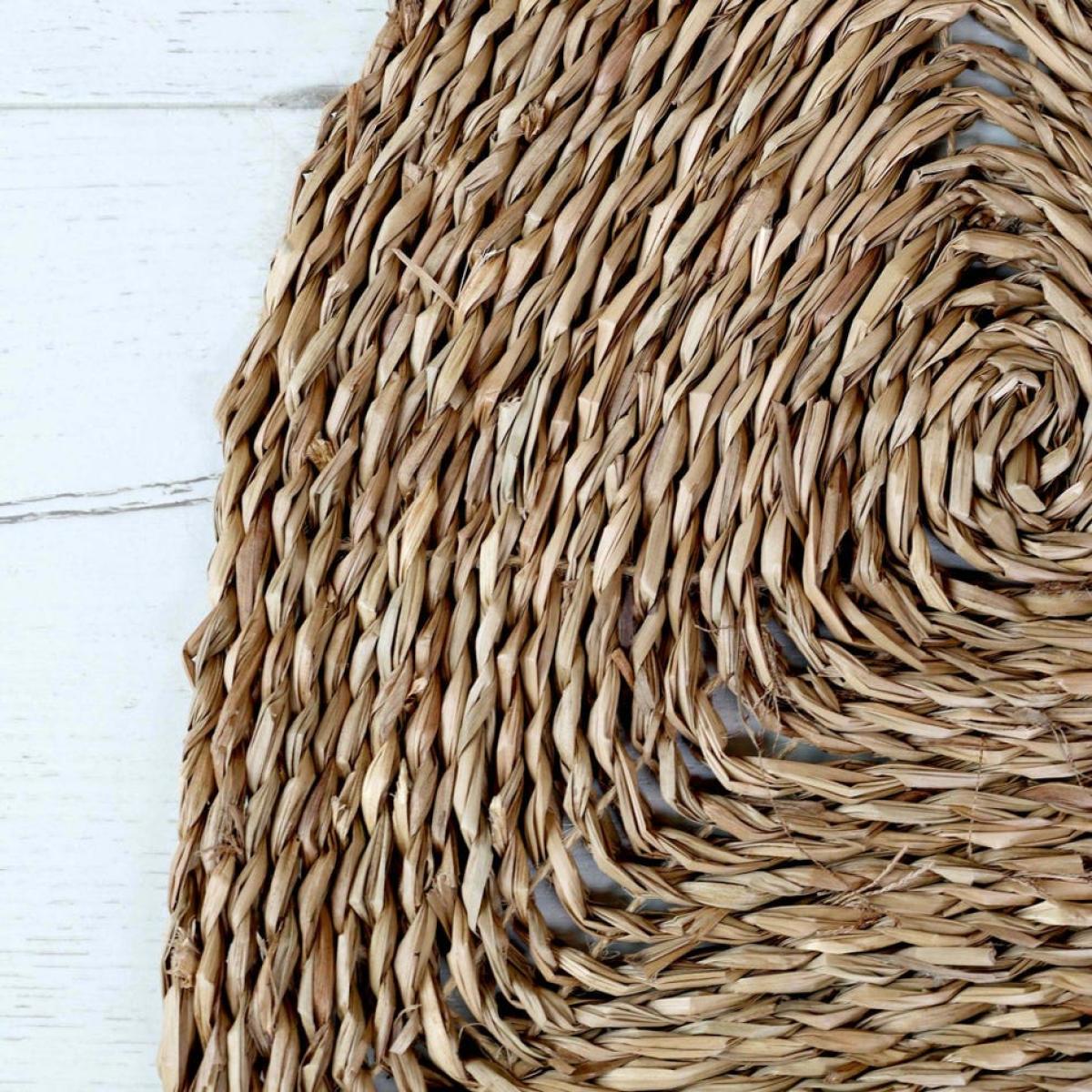 A natural round rug, woven from textured seagrass with a geometric star design, a bohemian addition to your sitting room or bedroom. Diameter 90cm. Made of seagrass. Remove spills immediately by blotting with a dry cloth. Professional cleaning is recommended. Loose threads can be trimmed with clean, sharp scissors. This product is woven from natural materials so the size, pattern and colour will vary.