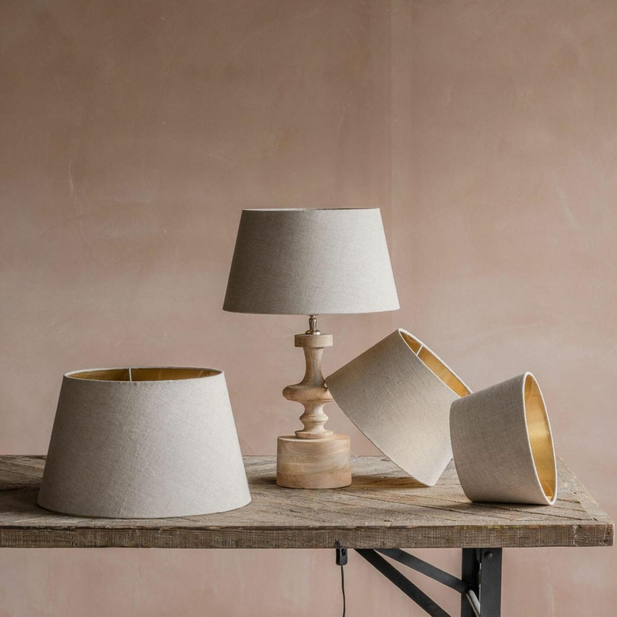 Keep a hint of glamour whilst adding an organic touch to your living space with these natural linen and gold lampshades. Available in four sizes, these shades will pair beautifully with a natural wooden table lamp.