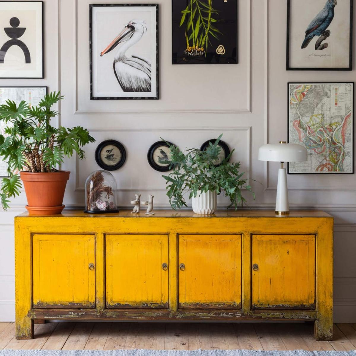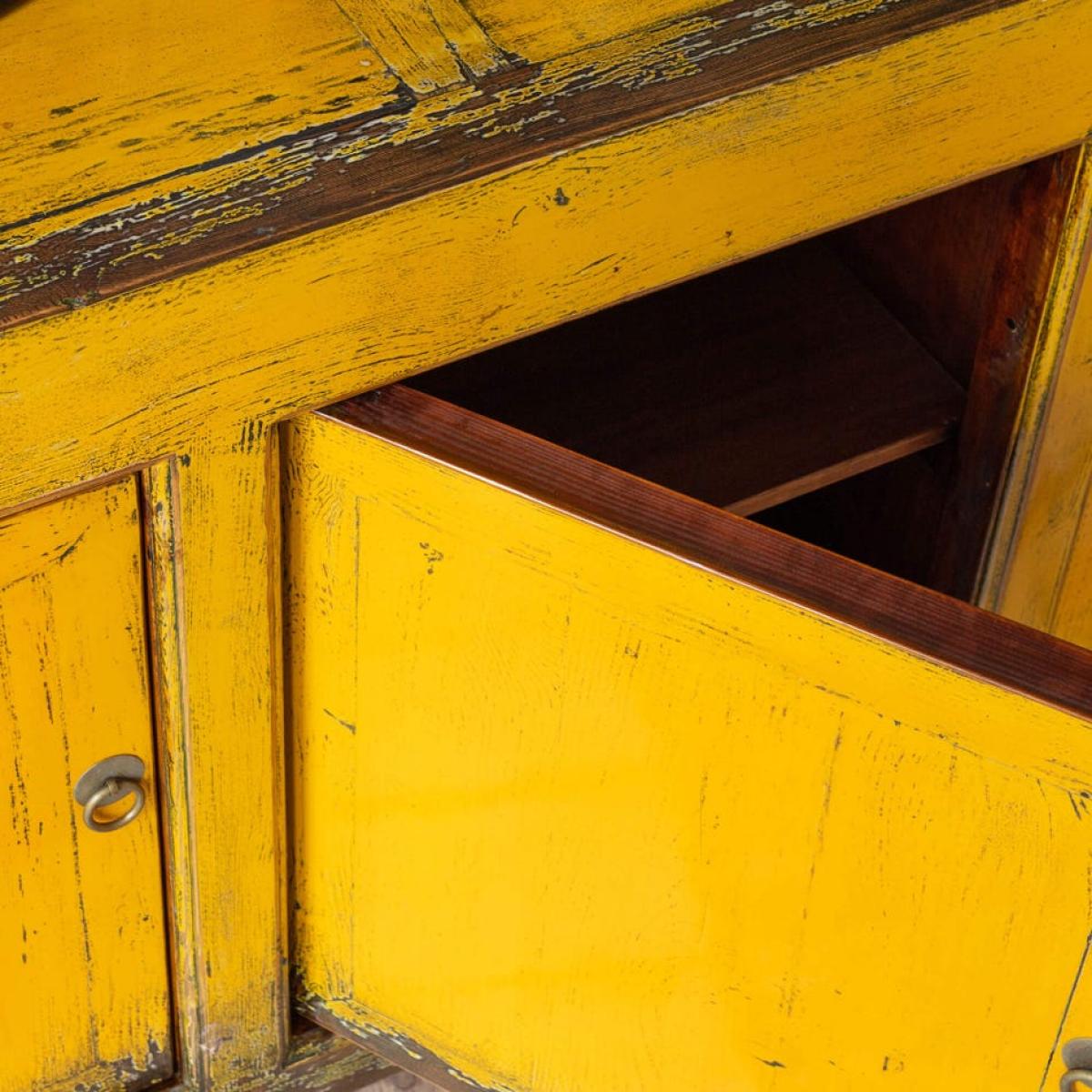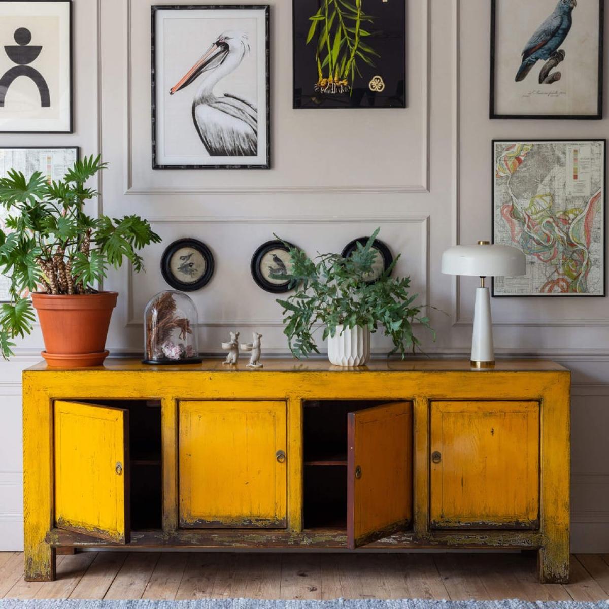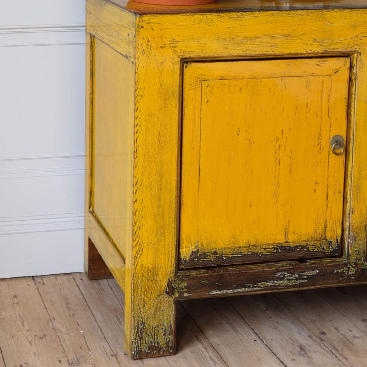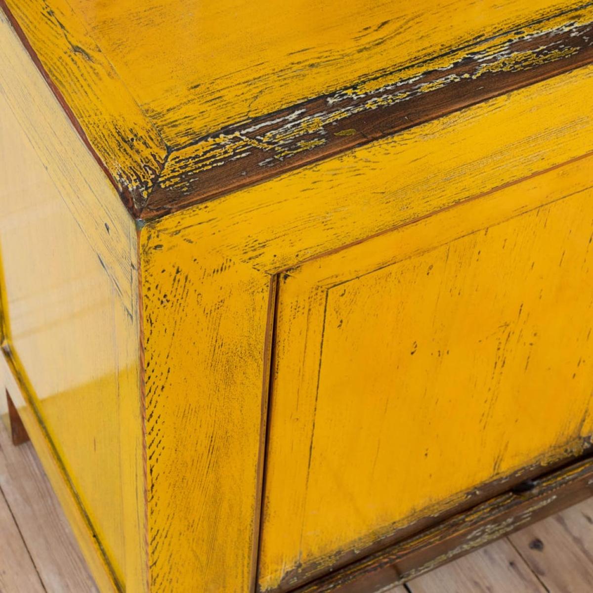 Our Lingbao Four Door Cabinet is a storage solution with vibrant style. Handcrafted from pine wood, the distressed finish of the mustard yellow paint and circular iron handles will transform a space with vintage elegance. Concealed behind four doors is ample space to store your household items and accessories, with each cupboard featuring one removable shelf to help keep everything organised. This will make an ideal sideboard in your hallway or sitting room.