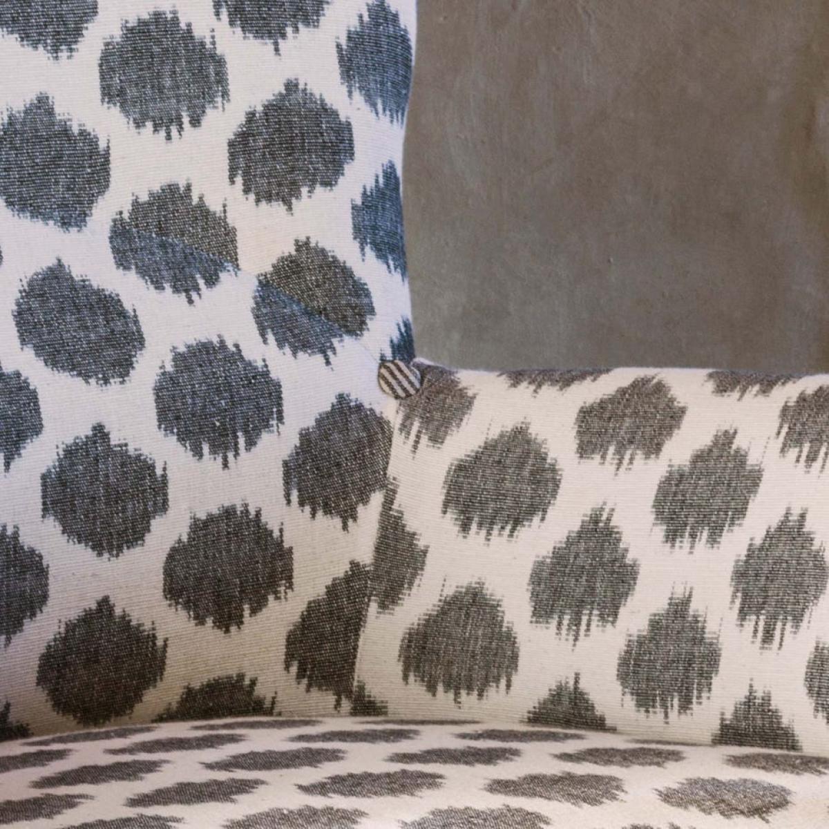 Handcrafted in India, the Louise armchair is upholstered in natural linen that has been marked, tied and dyed before being hand-woven to create the striking ikat design. A complex, skill-intensive process passed down through generations, each piece will be truly unique. Complete with a striped linen back, mango wood legs and brass stud detailing.
