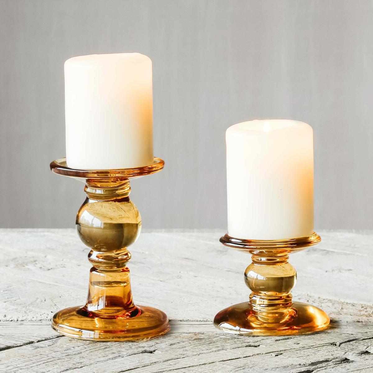 An amber candle holder made of glass with a curved and shaped stem, top with coloured candles at dinner or frame your mantelpiece with a pair in each style. Low (CJA1046):H7 x Diameter 9cm. Tall (CJA1047): H13 x Diameter 9cm. Suitable for pillar candles: max. Diameter 8cm. Made of soda lime glass. The exact colour and finish may vary.