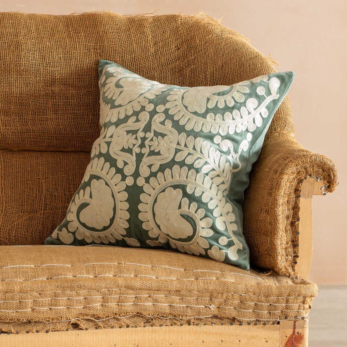 Beautifully embroidered with the Lucia leaf design, these square velvet cushions are perfect for adding an elegant touch to a sofa, armchair or bed. Each cushion is hand-crafted from sumptuously soft, pastel-toned velvet and filled with a plump feather inner for luxurious comfort.