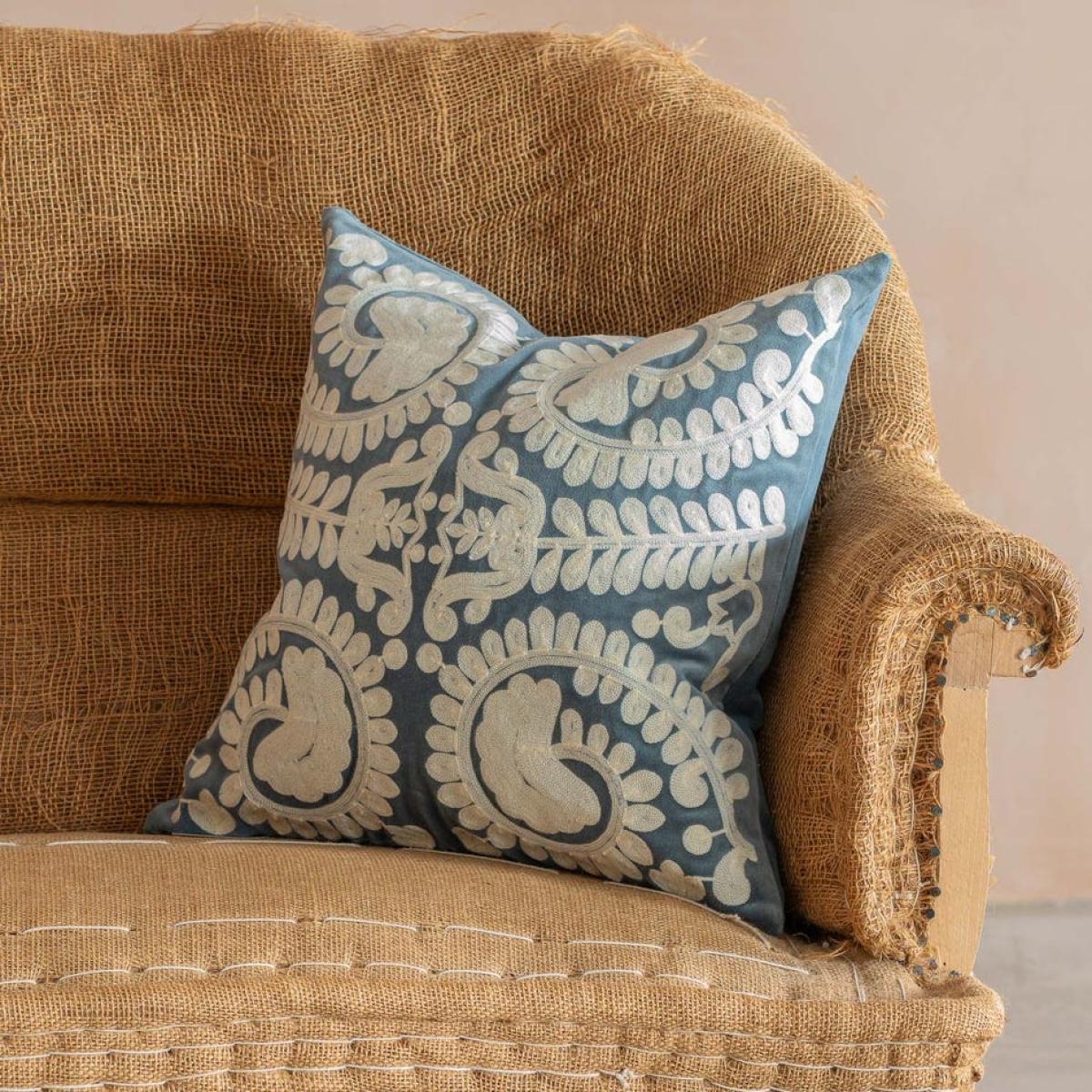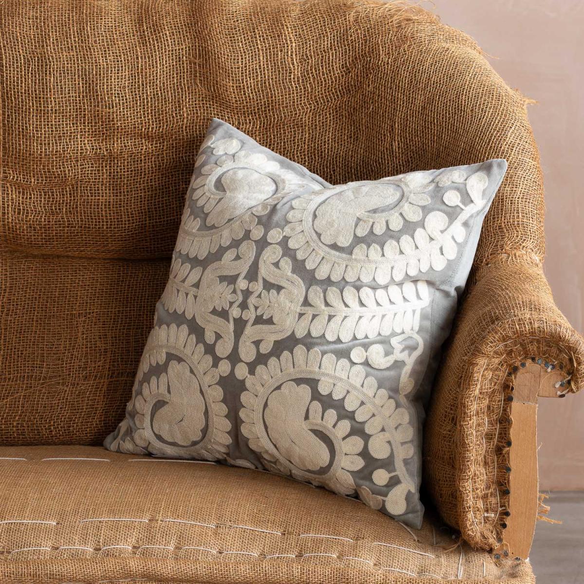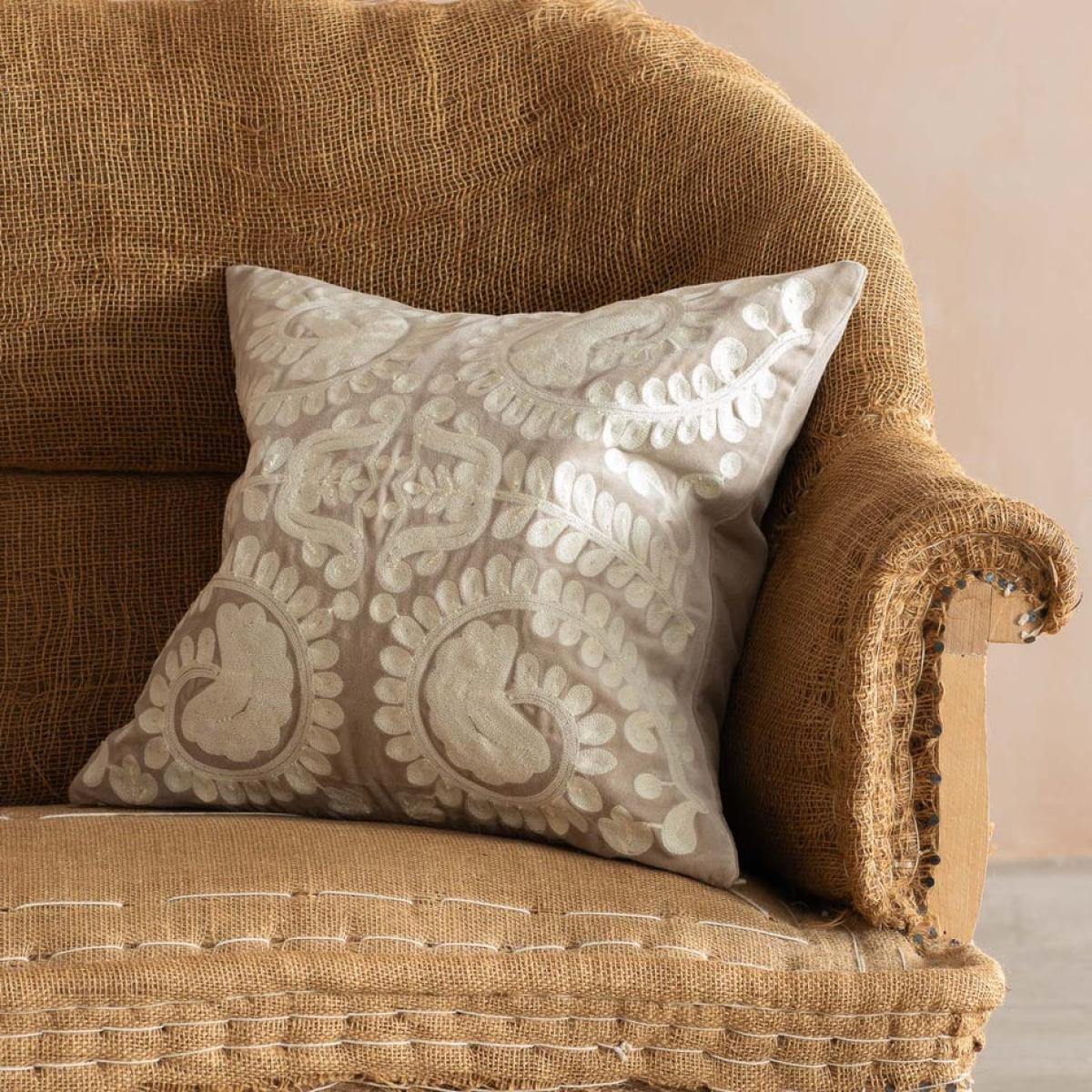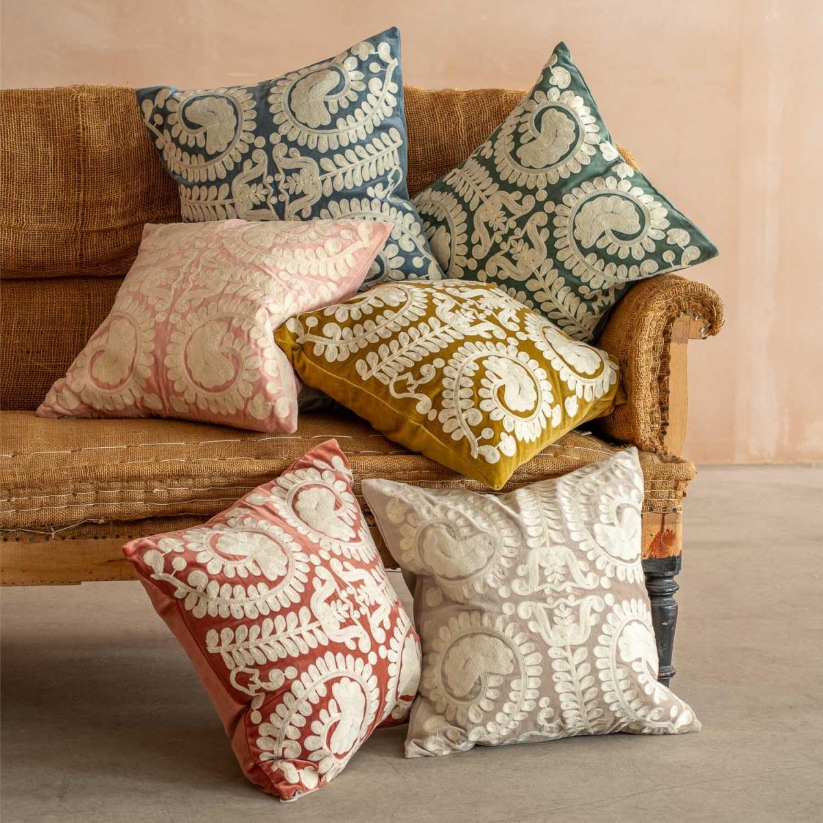 Beautifully embroidered with the Lucia leaf design, these small square velvet cushions are perfect for adding an elegant touch to a sofa, armchair or bed. Each cushion is hand-crafted from sumptuously soft, pastel-toned velvet and filled with a plump feather inner for luxurious comfort. H45 x W45cm. Handmade from cotton velvet. Includes a feather filled inner. Dry Clean Only. Exclusive to Graham and Green. Due to the nature of velvet, colour and shade may vary from screen image.