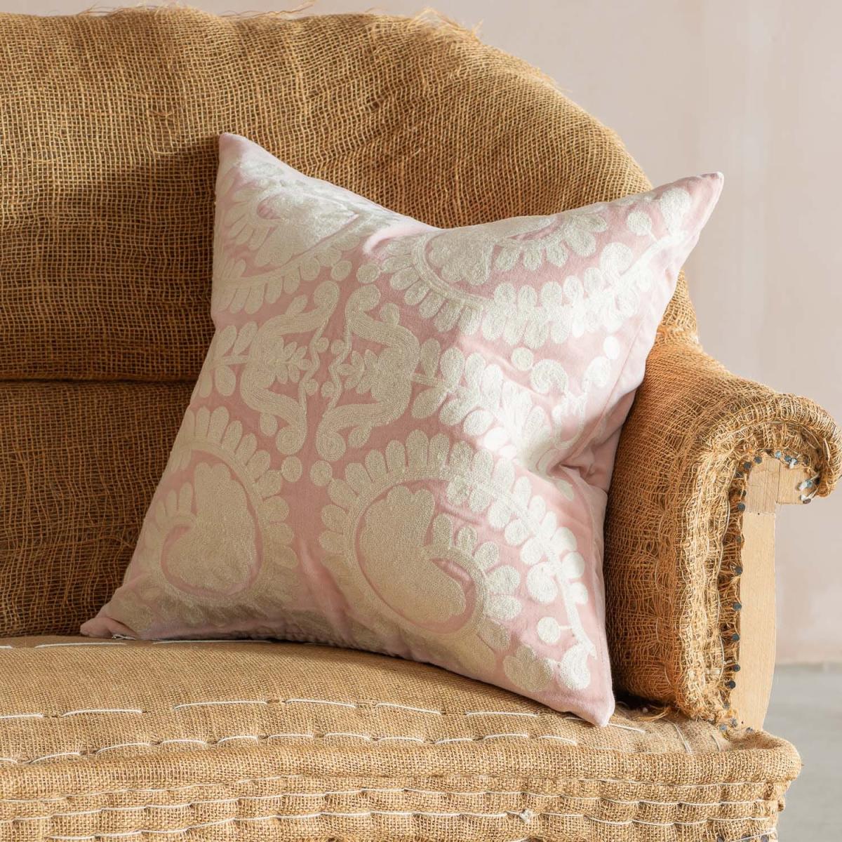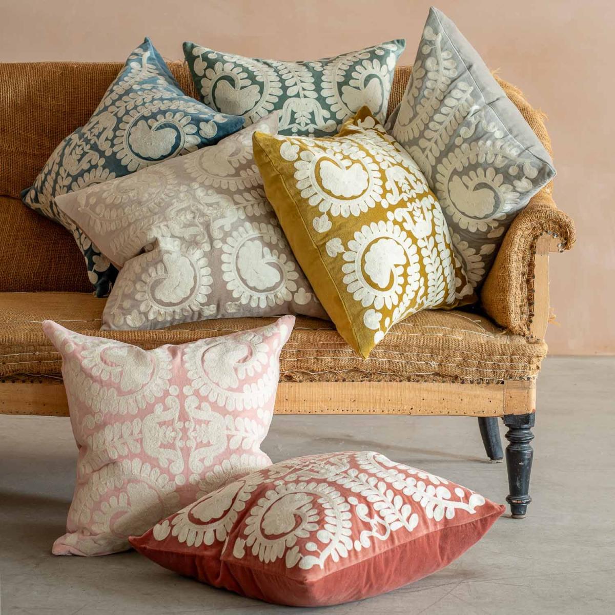 Beautifully embroidered with the Lucia leaf design, these square velvet cushions are perfect for adding an elegant touch to a sofa, armchair or bed. Each cushion is hand-crafted from sumptuously soft, pastel-toned velvet and filled with a plump feather inner for luxurious comfort.