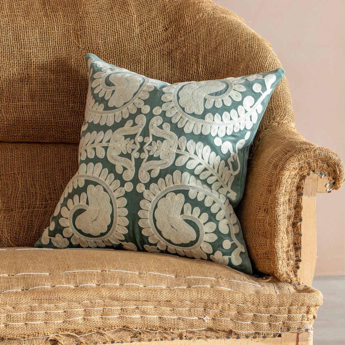 Beautifully embroidered with the Lucia leaf design, these small square velvet cushions are perfect for adding an elegant touch to a sofa, armchair or bed. Each cushion is hand-crafted from sumptuously soft, pastel-toned velvet and filled with a plump feather inner for luxurious comfort. H45 x W45cm. Handmade from cotton velvet. Includes a feather filled inner. Dry Clean Only. Exclusive to Graham and Green. Due to the nature of velvet, colour and shade may vary from screen image.