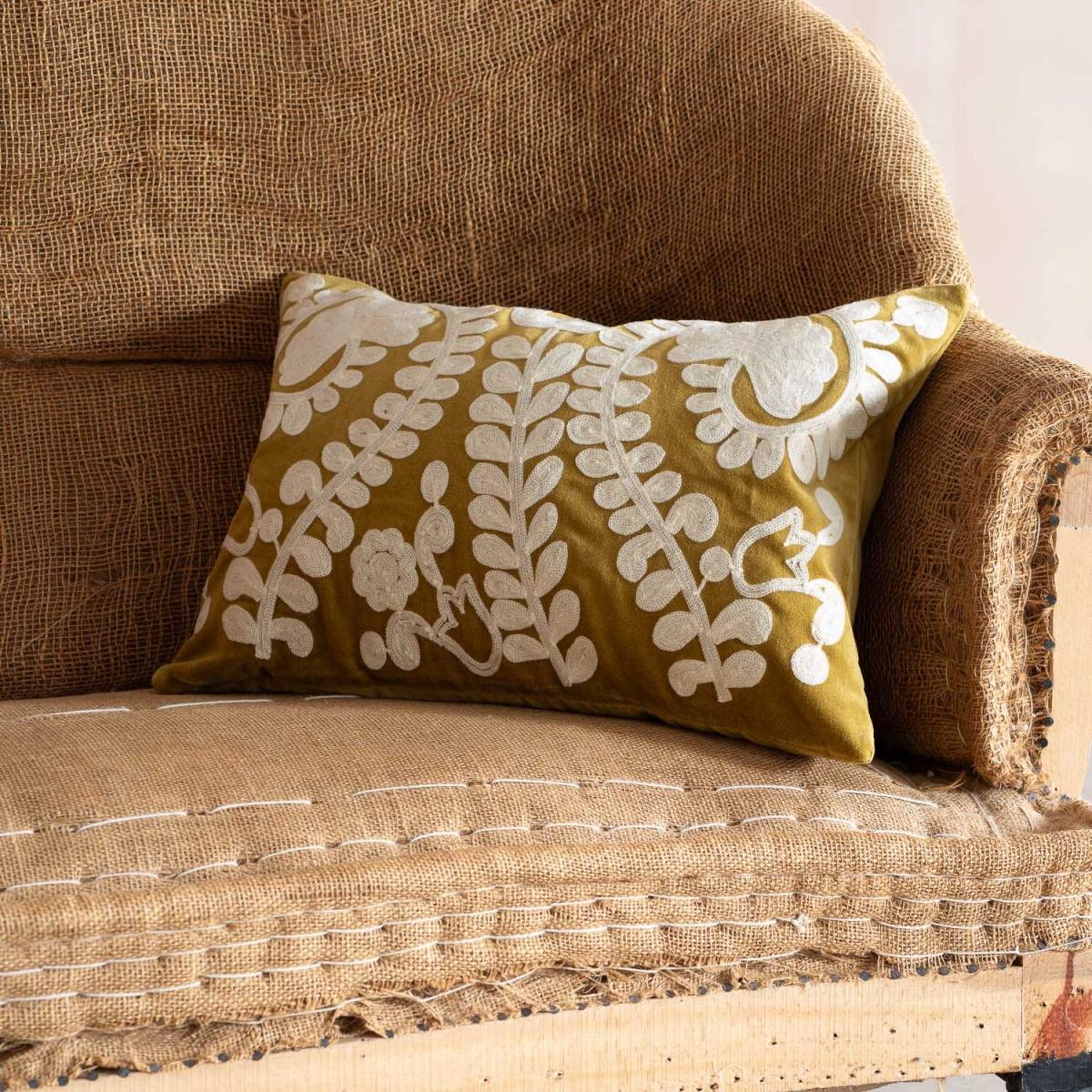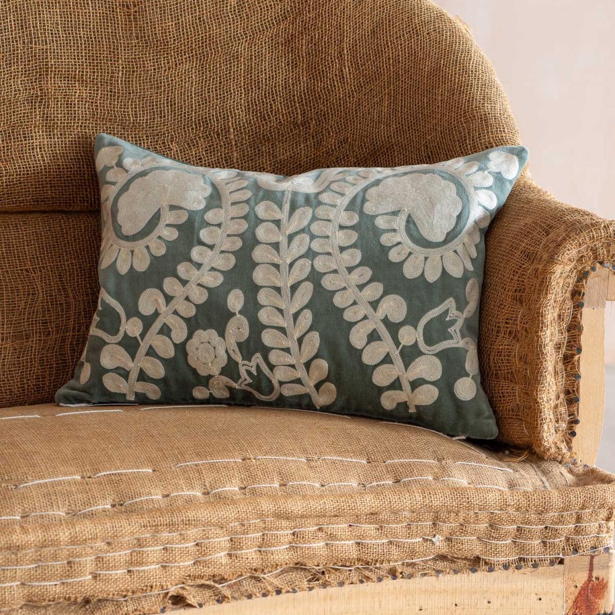 Beautifully embroidered with the Lucia leaf design, these rectangular velvet cushions are perfect for adding an elegant touch to a sofa, armchair or bed. Each cushion is hand-crafted from sumptuously soft, pastel-toned velvet and filled with a plump feather inner for luxurious comfort.