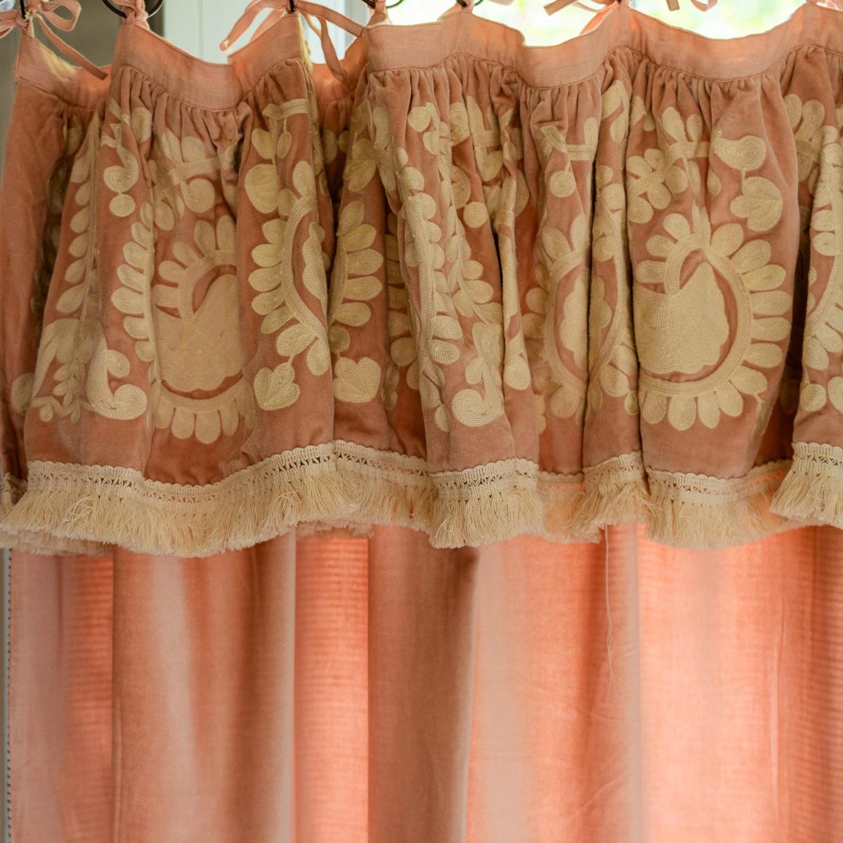 Each velvet curtain has been beautifully hand-crafted from sumptuously soft rose pink velvet, featuring a frilled panel along the top intricately embroidered with our Lucia leaf design and finished with natural tassel fringing. Perfect for complementing a country cottage style and ideal for pairing with our matching velvet curtain ties.