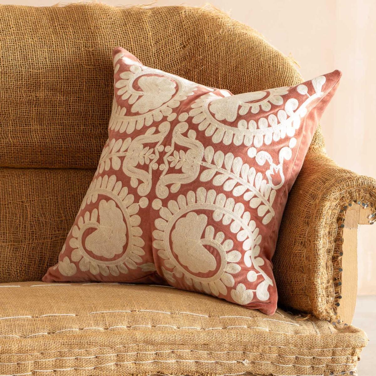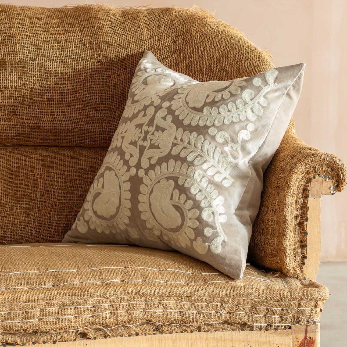 Beautifully embroidered with the Lucia leaf design, these square velvet cushions are perfect for adding an elegant touch to a sofa, armchair or bed. Each cushion is hand-crafted from sumptuously soft, pastel-toned velvet and filled with a plump feather inner for luxurious comfort.