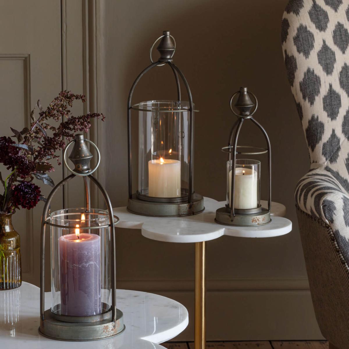 Create a warm glow in your home with these antique-style lanterns. Its glass hurricane is big enough to hold a pillar candle and sits inside a beautifully antiqued metal frame. Great for adding to a fireside paired with our  dusky pink pillar candles. Small (CPY1002): H32cm x Diameter 12cm. Medium (CPY1003): H38cm x Diameter 15cm. Large (CPY1004): H43cm x Diameter 17cm. Made from iron and glass. Take extra care with the glass during use as this can get hot.