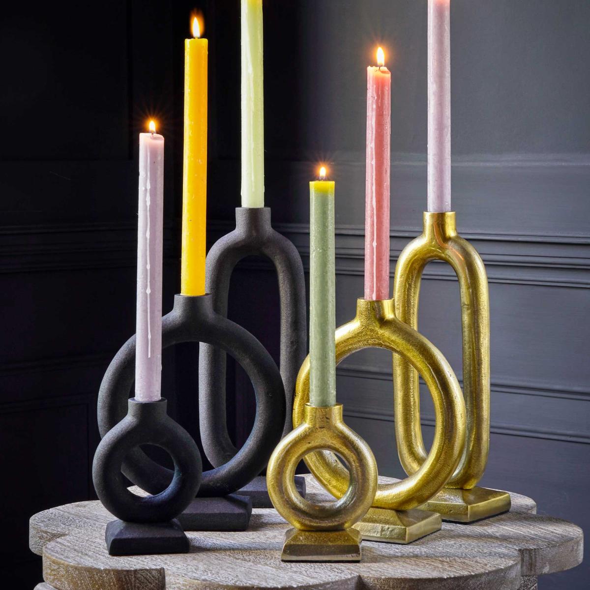 Crafted from aluminium with a brass finish, collect a pair of these circular candle holders for your mantlepiece and finish with fluorescent coloured candles. Small (AIE1026): H14 x W10 x D7cm. Medium (AIE1028): H22 x W18 x D18cm. Made of aluminium. The exact colour and finish may vary.