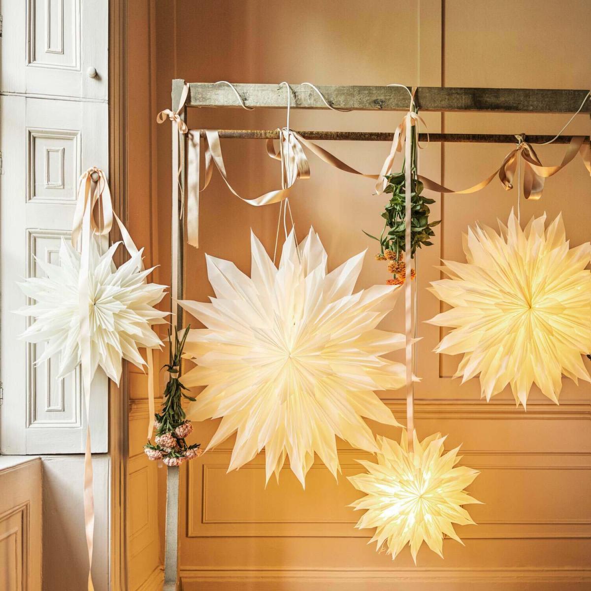 Each of these delicate paper lamp shades is cut from sheer paper made from wood pulp and layered into an elaborate flower or starburst shape. Hang them around a pendant light fitting or string lights to create a soft and romantic look in your home. Collect a few different sizes and hang them together so that they cascade from the ceiling in a trail of blossoms and stars. Small Flower (UUD1000): H40 x W40cm. Medium Flower (UUD1001): H60 x W60cm. Large Flower (UUD1002): H80 x W80cm. Small Starburst (UUD1003): H40 x W40cm. Medium Starburst (UUD1004): H60 x W60cm. Large Starburst (UUD1005): H80 x W80cm. Suitable for a hanging light pendant and 40W bulb maximum (both not included). Crafted from wood pulp. Read the Lampshade Guide.