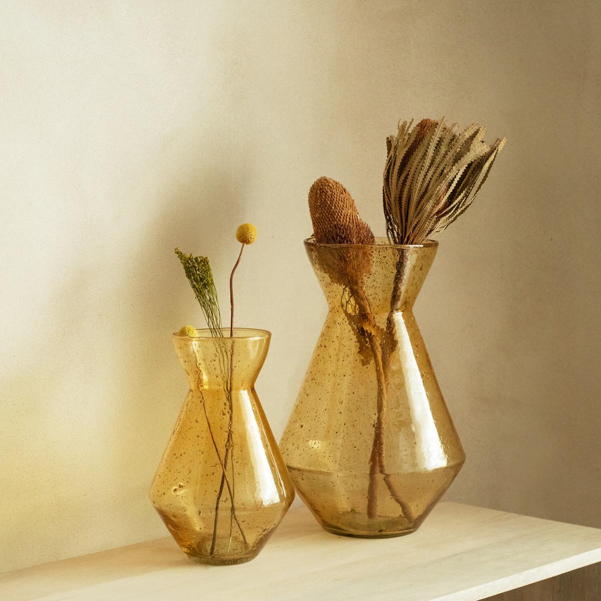 Bring richness to your floral displays with an angular glass vase in a warm yellow that's flecked and mottled to create a unique speckled finish. Small (LYH1006): H25 x Diameter 16cm. Medium (LYH1007): H34 x Diameter 23cm. Made of glass. The exact colour and finish will vary and bubbling and flecks are to be expected to add character to the design.