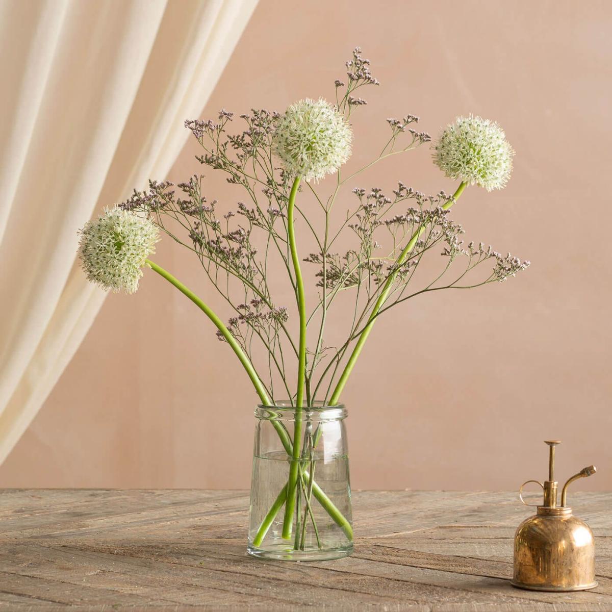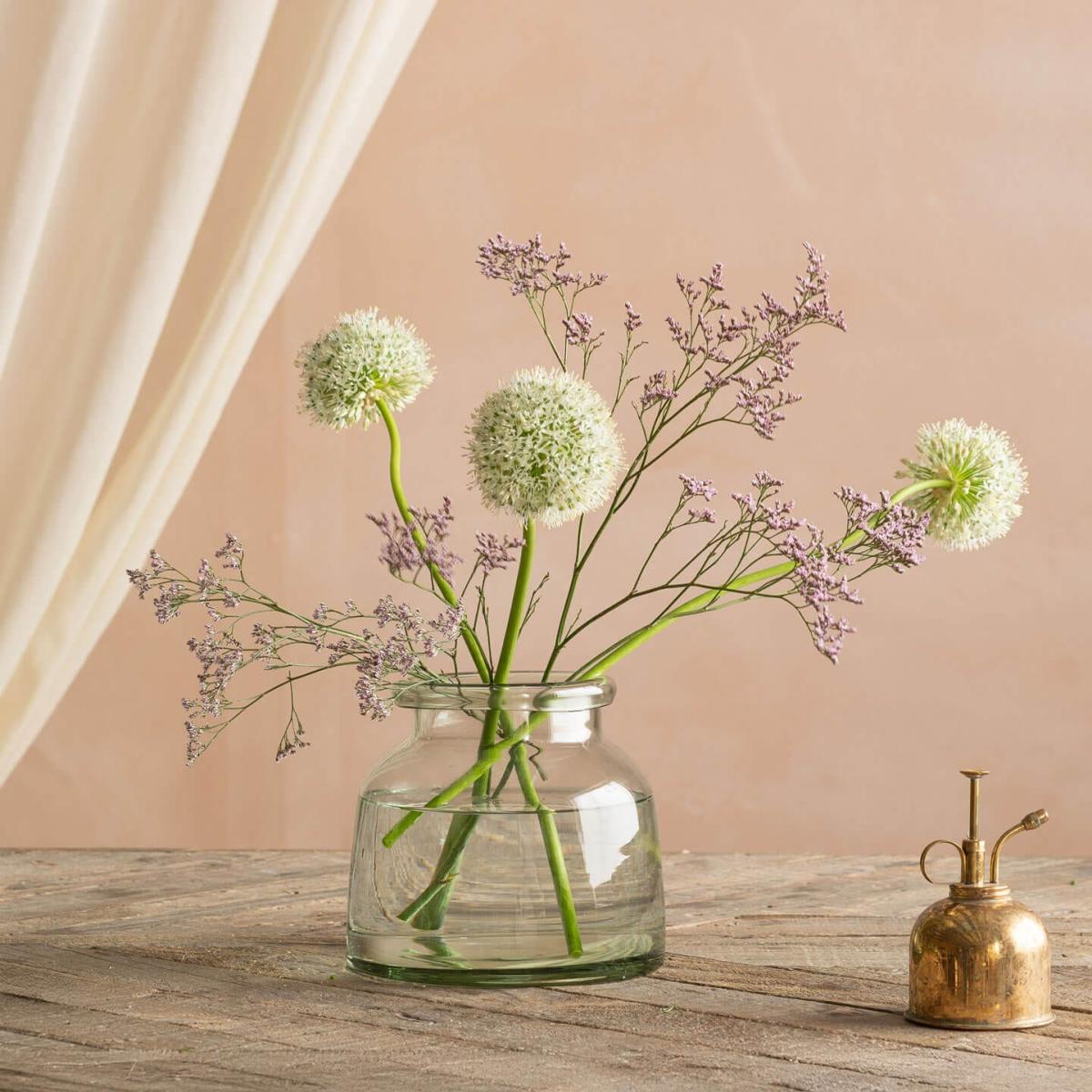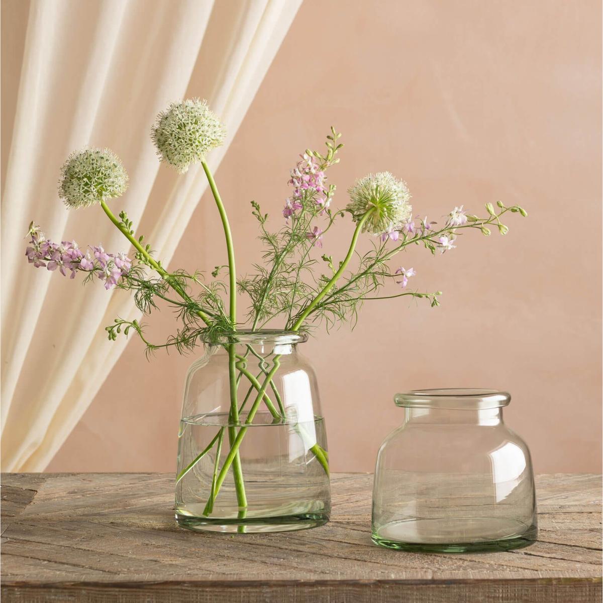 These clear glass vases are hand-blown from recycled glass and inspired by traditional pickle jars. Their wide bottoms and rolled tops make them perfect for displaying a medium bouquet or a handful of seasonal stems.
