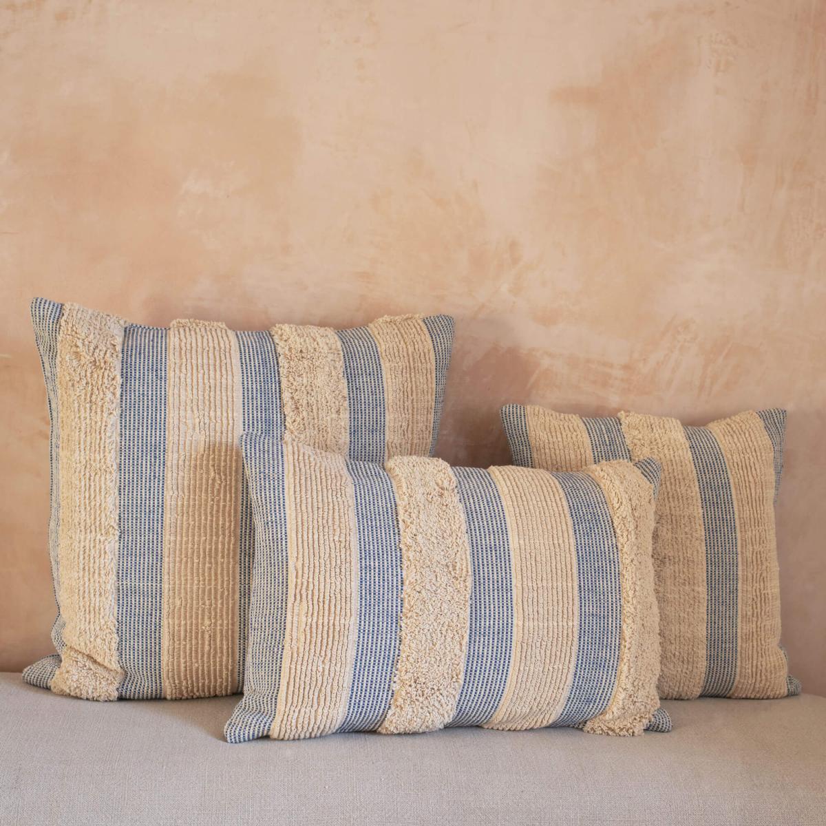 Woven using the traditional Sardinian weaving technique of Pibiones, ancient word for grapes that refers to the delicate bumps created, these textural cushions include a chunky stripe that stands out against the sky-blue cotton background. A tactile finishing touch for your sitting room sofa or an ethereal addition for your bedroom. Rectangular: H40 x W60cm. Square: H50 x W50cm. Large Square: H60 x W60cm. Cover made of 88% Cotton, 6% Polyester and 6% Viscose. Feather pad included. We recommend dry clean only.