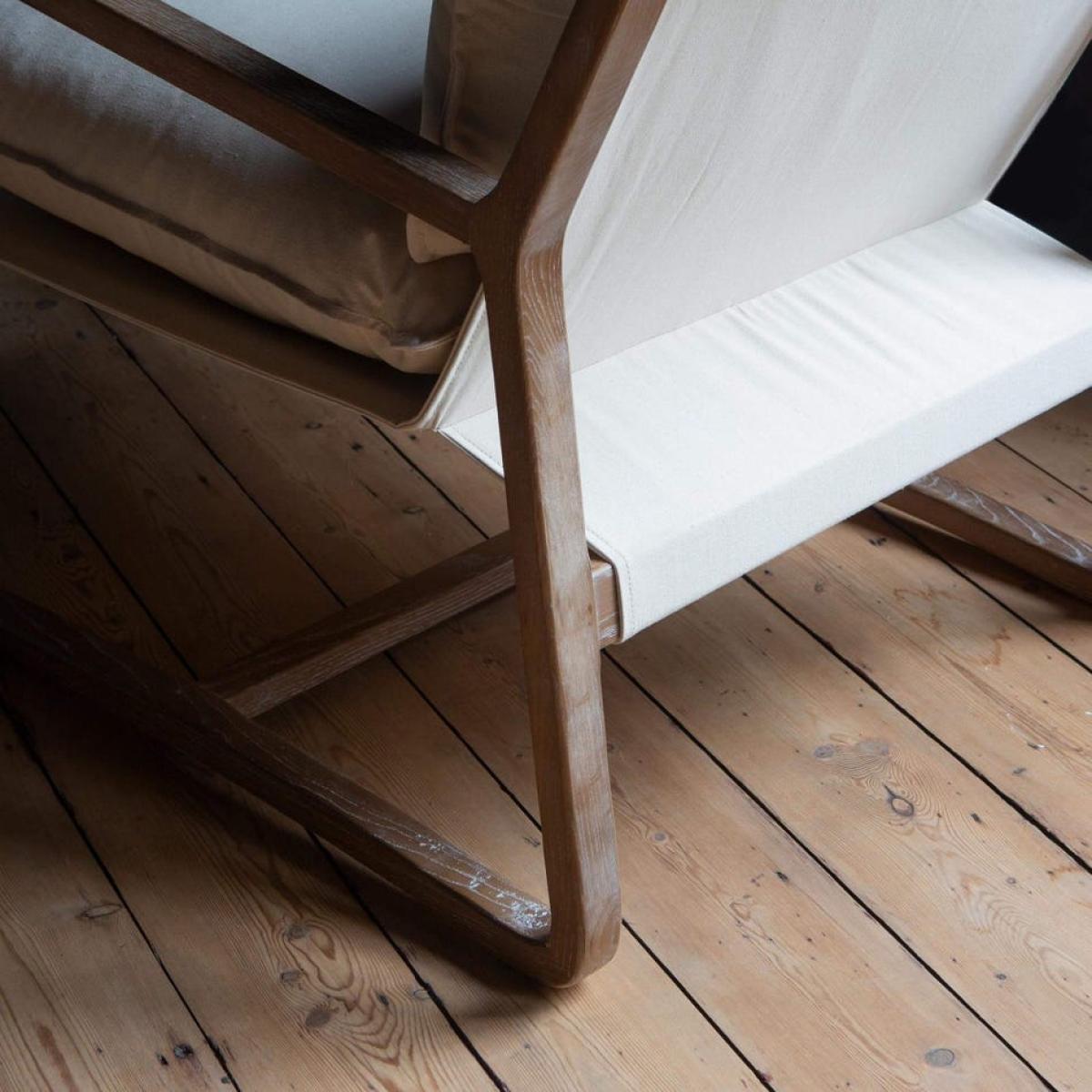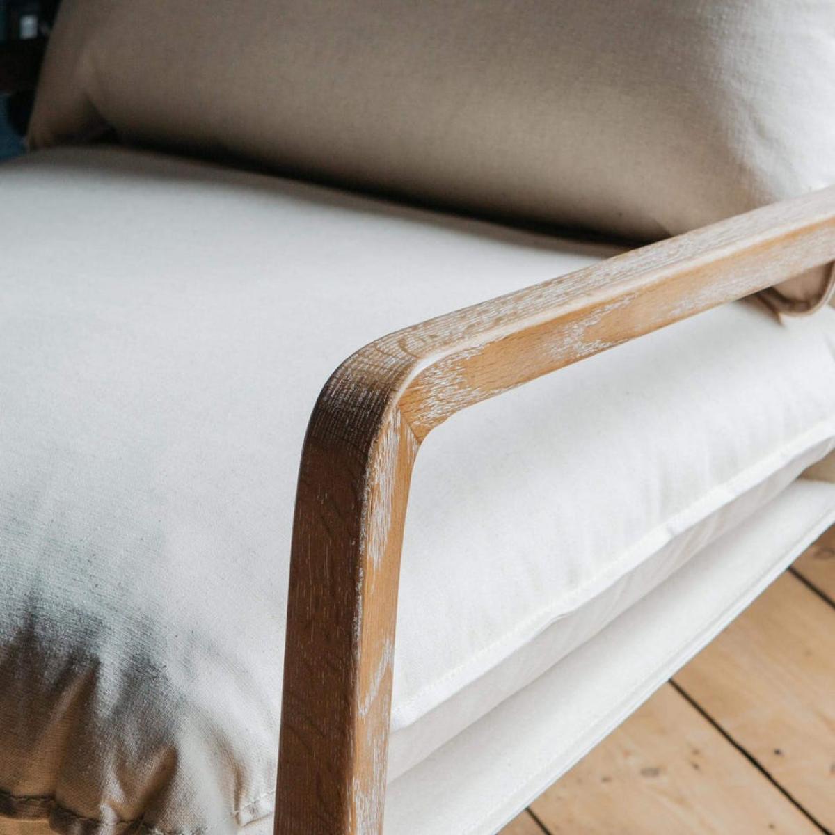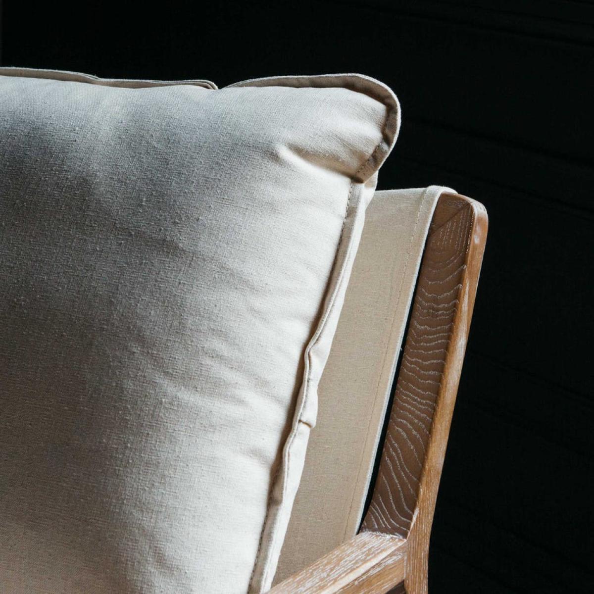 A retro-inspired armchair with an angular frame crafted from ash wood and upholstered in natural linen with a plump seat cushion. H74 x W72 x D84cm. Seat cushion not removable. Made of ash wood, foam and linen. We recommend spot clean only. This product is made from natural materials so the exact colour and finish will vary.