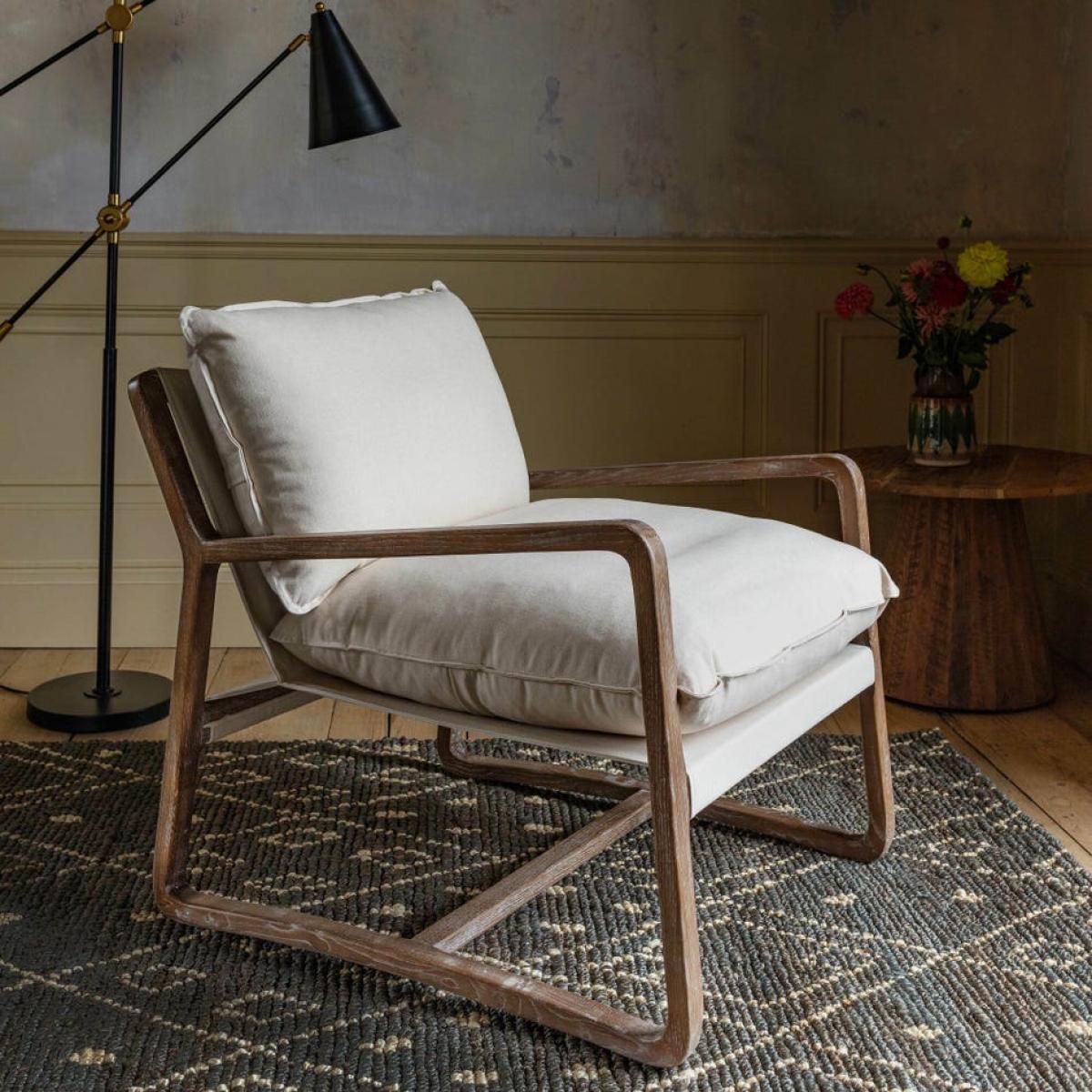 I love this armchair for its relaxed yet sophisticated look, thanks to the natural linen fabric and sleek wooden frame. It works particularly well in Scandi or minimalist interiors, but can also add a touch of understated elegance to boho or neutral schemes. To style it effectively, consider layering with textured cushions or throws for comfort, and position it in a cosy corner or beside a mid-century side table to create a welcoming reading nook. Its versatile design makes it a practical choice for both living rooms and bedrooms, adding a laid-back charm without sacrificing style.