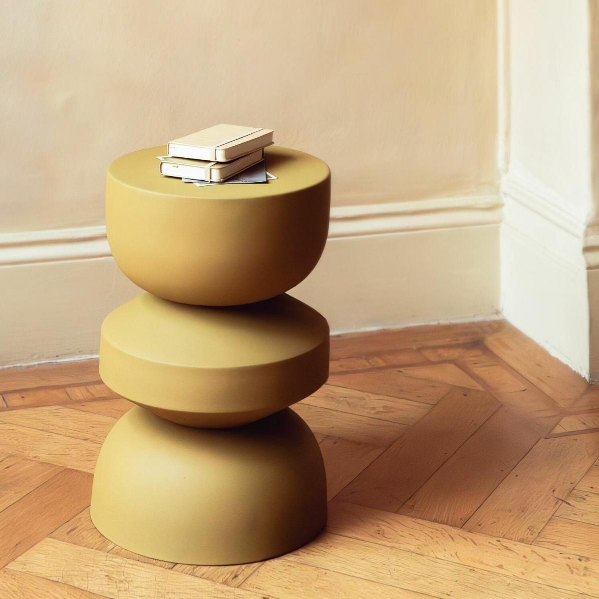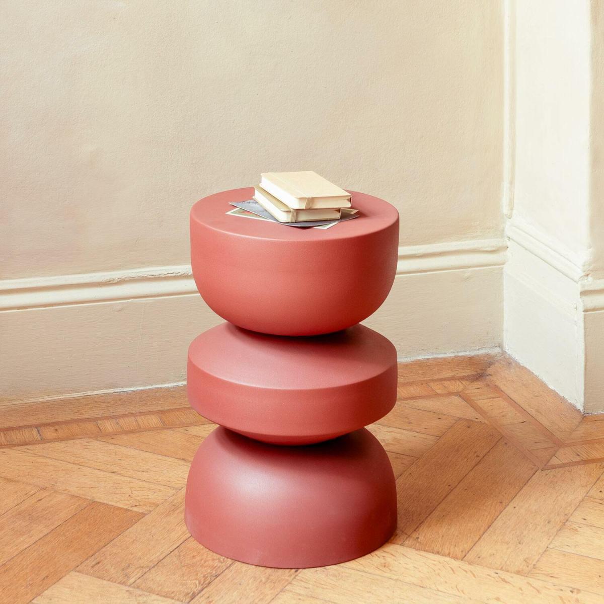 A bold and playful statement for a sitting room or bedroom, these metal drum stools feature an abstract silhouette with a smooth matte finish. Available in three vibrant colours: mustard yellow, terracotta red, and olive green.