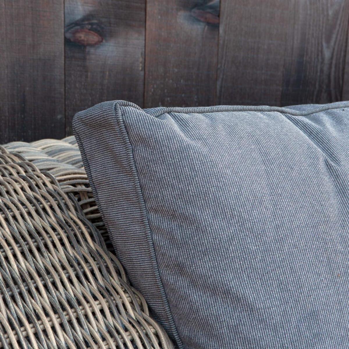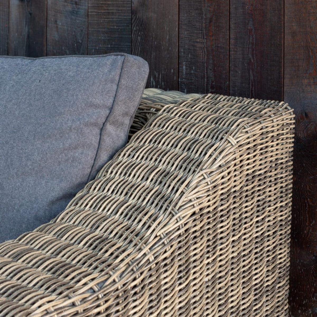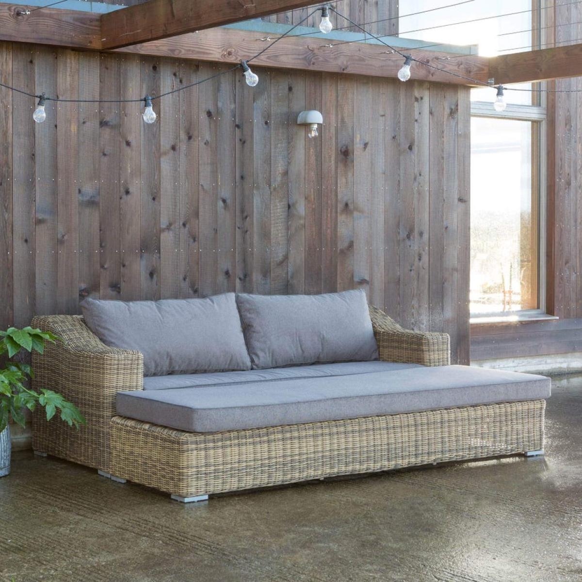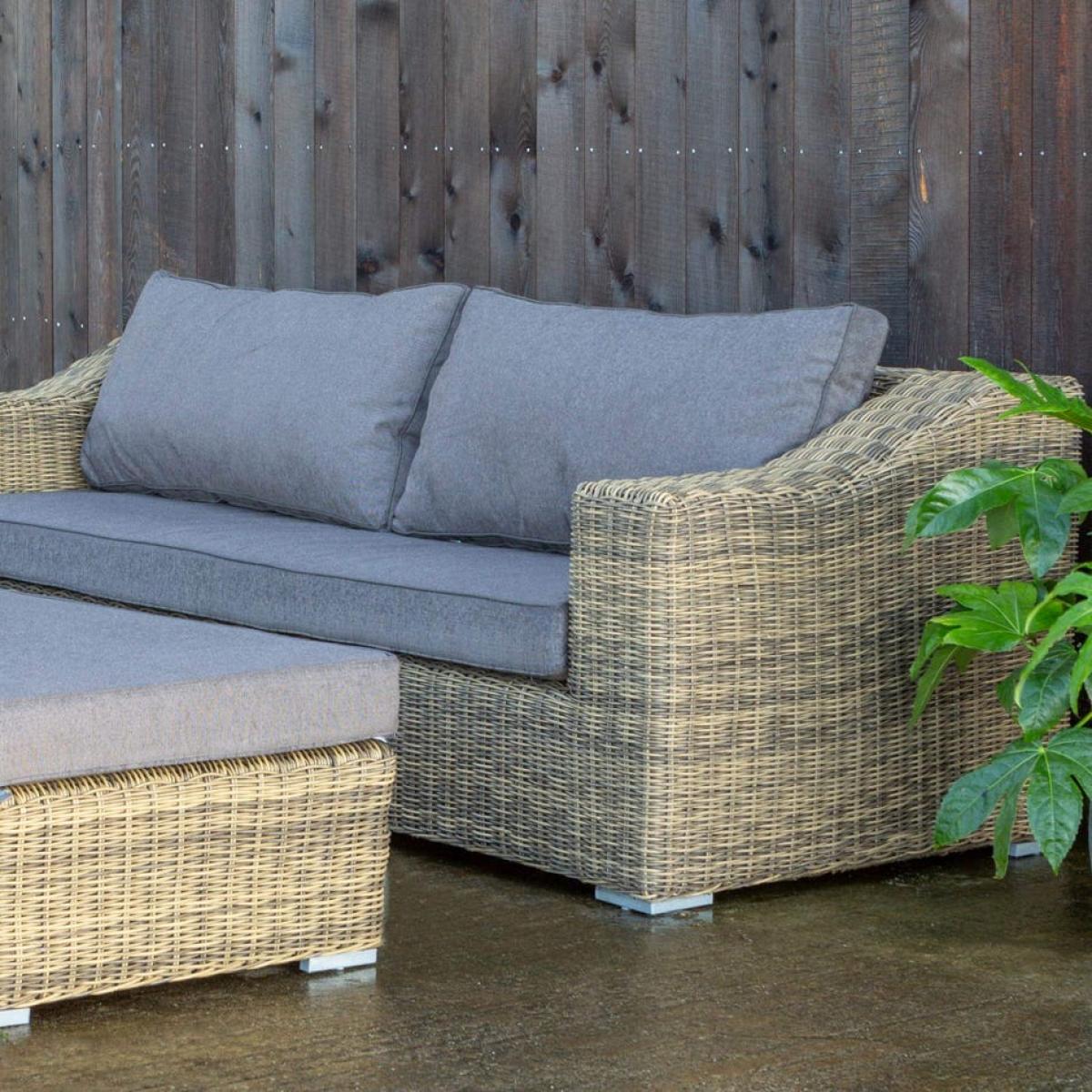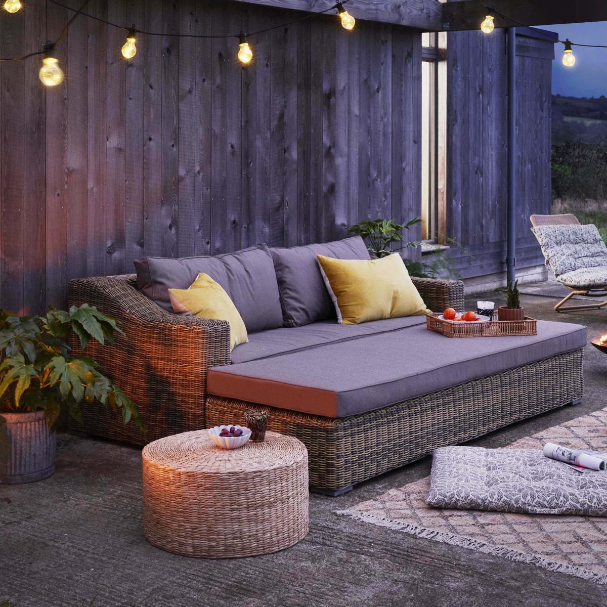 Relax and unwind on a luxurious outdoor sofa that doubles as a lounger when paired with the matching long footstool, both in a rattan effect with a natural finish and featuring charcoal foam cushions.