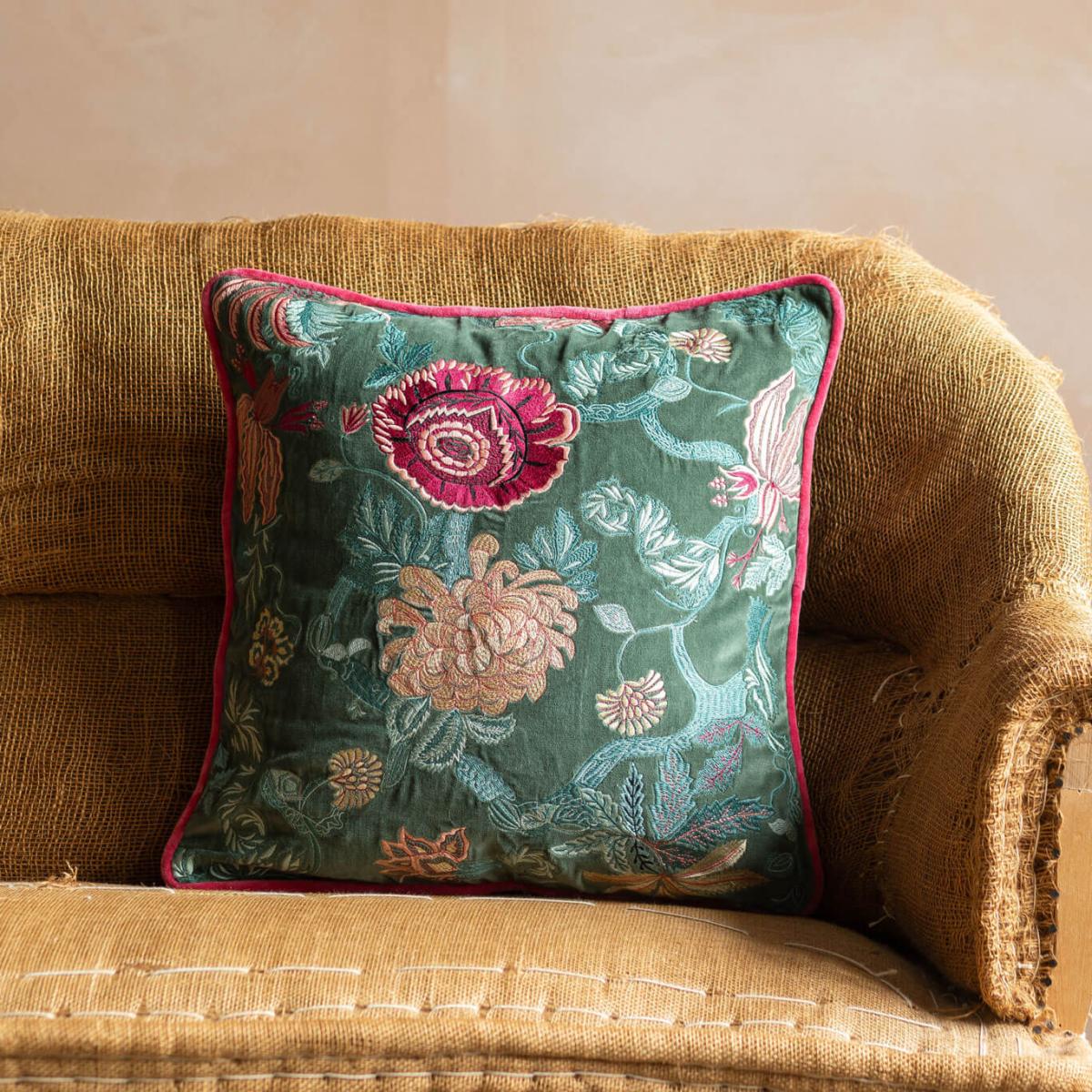 Graham and Green Rosalind Embroidered Green Velvet Square Cushion