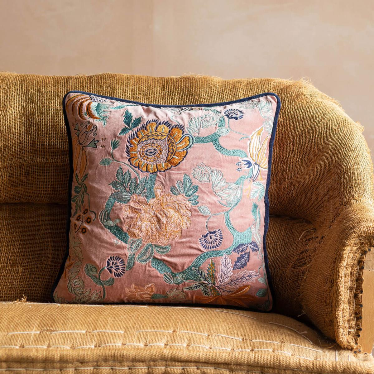 These Rosalind square cushions are expertly embroidered with beautifully contrasting floral designs on bold cotton velvet backgrounds. Perfect for adding a whimsical touch and a vibrant pop of colour to your sitting room or bedroom. H50 x W50cm. Handcrafted from 100% cotton velvet. Includes feather filled inner. Dry Clean Only. Due to the handmade nature of the product, colour and finish may vary.