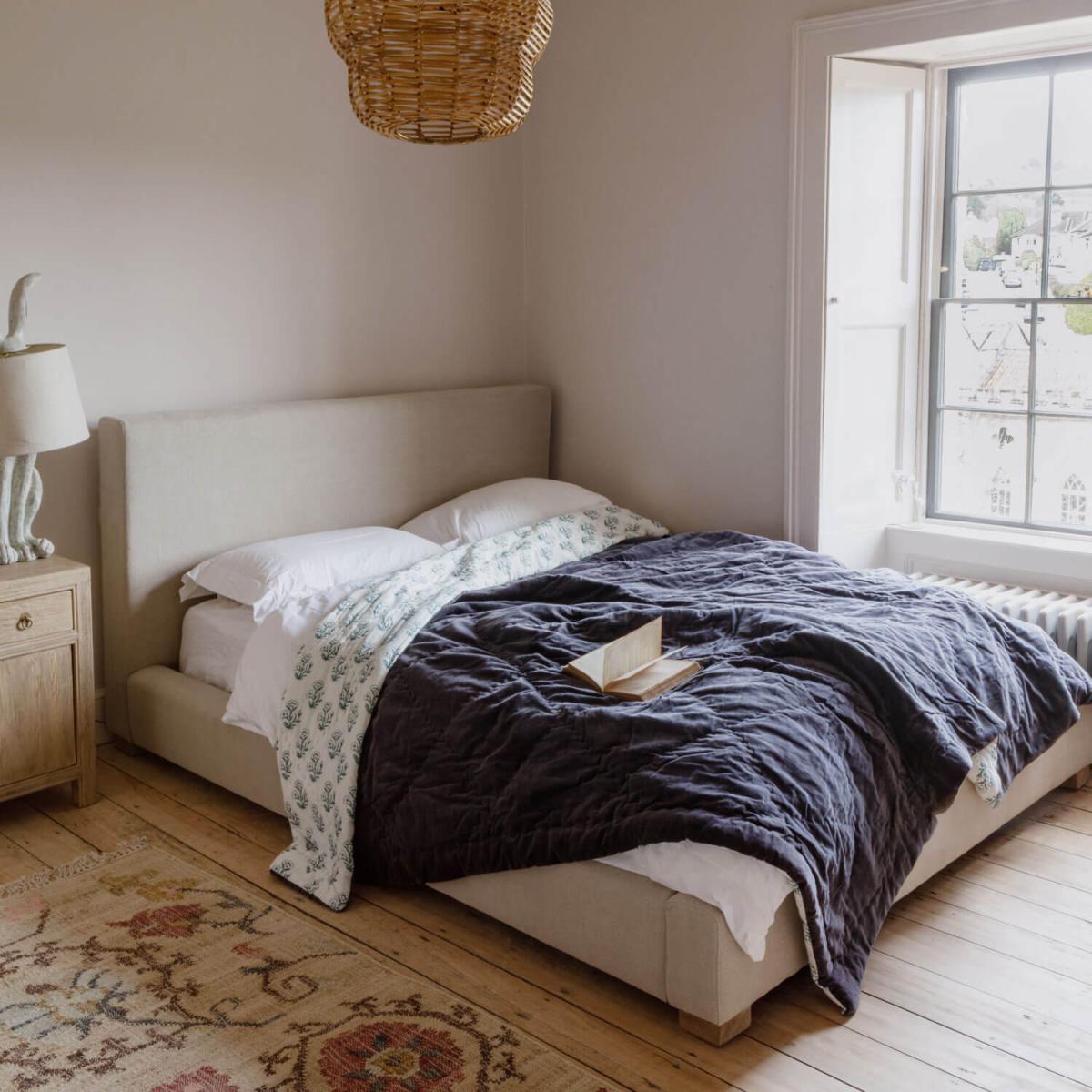 Entirely upholstered in our pure linen fabric over a sturdy ash wood frame, the Roxy bed embraces soft-to-touch texture in a natural colour. With a low to the ground look that's available in two spacious sizes, its relaxed feel makes for the ultimate restful night's sleep. King Size (TQZ1001) H103 x L232 x W179cm. Headboard height (excluding mattress): 103cm. Footboard height: 27cm. Clearance from floor to base: 10cm. Recommended mattress size: King (150 x 200cm). Super King Size (TQZ1002) H103 x L233 x W209cm. Headboard height: 103cm. Footboard height: 27cm. Clearance from floor to base: 10cm. Recommended mattress size: Super King (180 x 200cm). Frame made of sturdy fraxinus ash wood and soft foam. Solid slatted base. Upholstered in 100% natural linen.