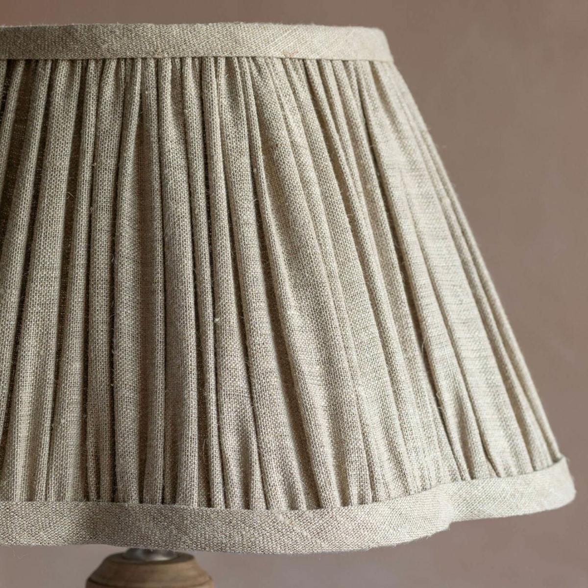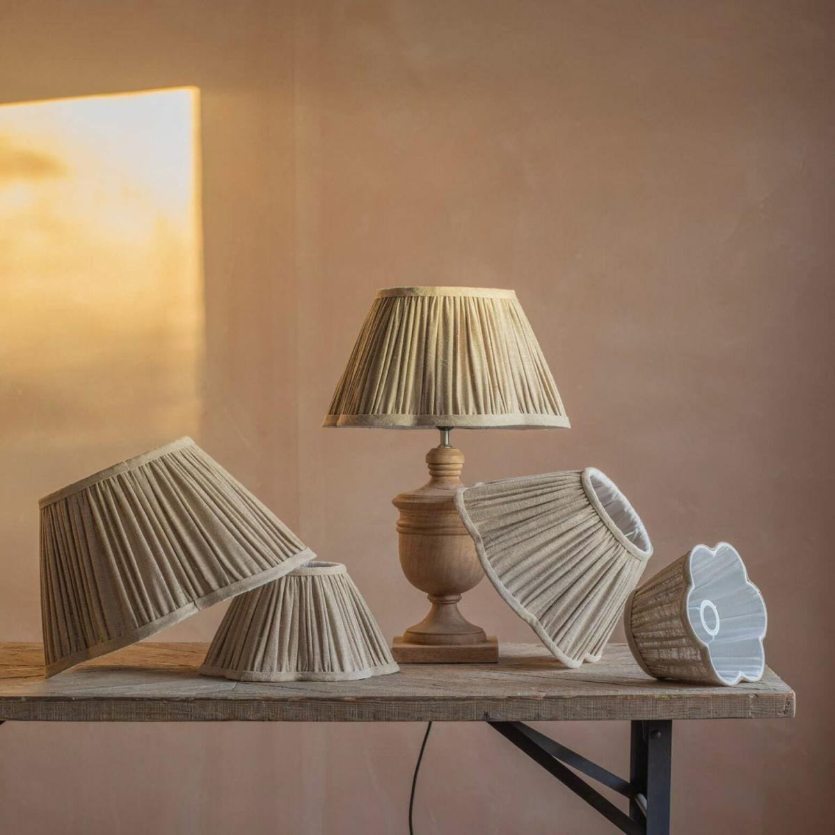 Introduce understated elegance to your living space with these scalloped-edge lampshades. Handmade with meticulously gathered edges which add texture and sophistication. The natural linen will complement a beautiful wooden table lamp while creating a warm and inviting ambiance in any room. 10" (ATC1029): Height: 15cm | Top Diameter 15cm | Bottom Diameter 25cm. 13” (ABK1014): Height: 20cm | Top Diameter 15cm | Bottom Diameter 33cm. 16” (ABK1015): Height 23cm | Top Diameter 18cm | Bottom Diameter 40cm. 18 " (ATC1030): Height: 24cm | Top Diameter 24cm | Bottom Diameter 45cm. Handmade from 100% linen with an iron frame. This product is handmade, so finishing may vary and seamlines may be visible. Read the Lampshade Guide.