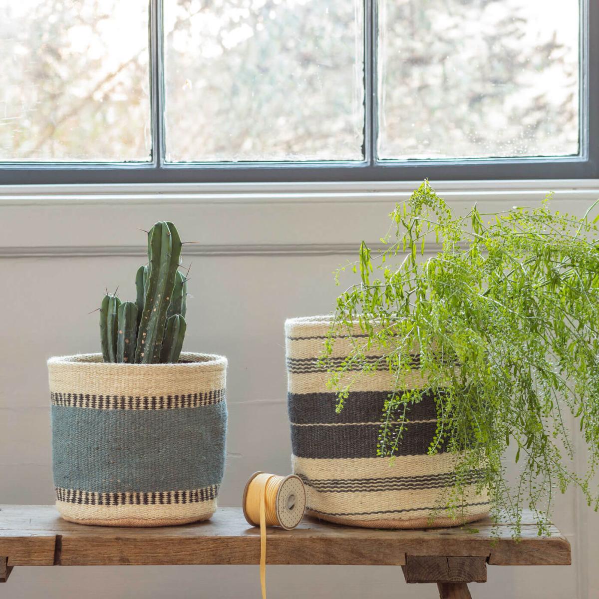 Handcrafted from woven jute, these set of two jute bins will add a cheerful pop of colour to your living space. Handy storage for around the home to keep small bits and bobs safe and together or as stylish covers for plant pots. Available in three bold colour combinations. Large bin: H25 x Diameter 25cm. Small bin: H20 x Diameter 25cm. Handmade from woven jute with a cotton lining. Sold as a set of two.