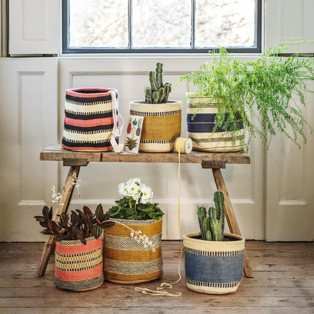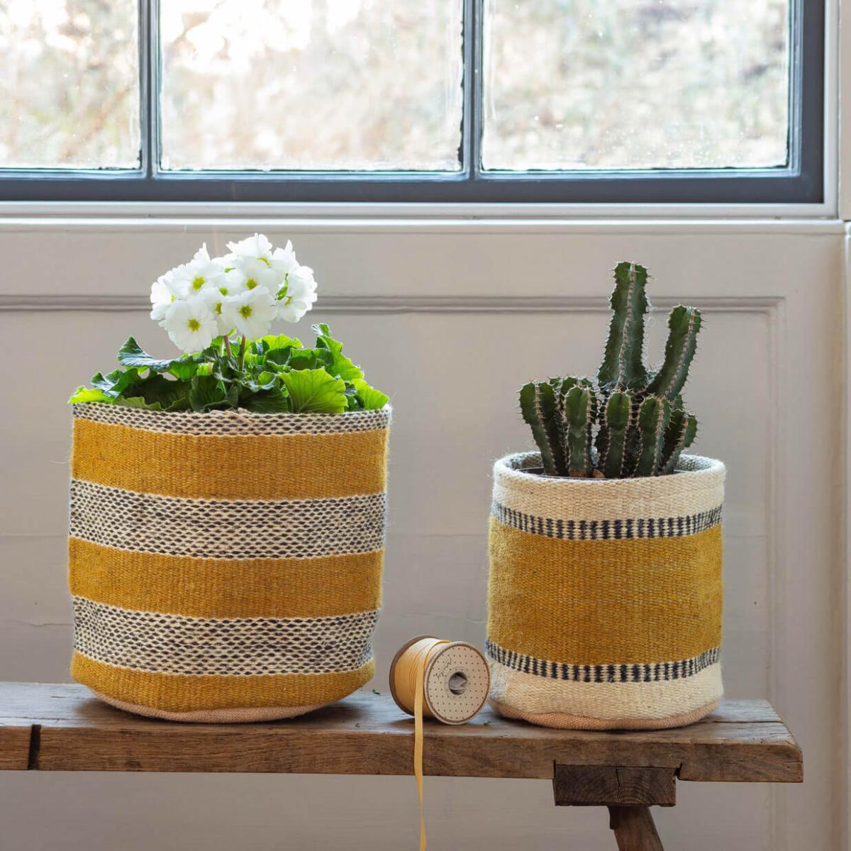 Handcrafted from woven jute, these set of two jute bins will add a cheerful pop of colour to your living space. Handy storage for around the home to keep small bits and bobs safe and together or as stylish covers for plant pots. Available in three bold colour combinations. Large bin: H25 x Diameter 25cm. Small bin: H20 x Diameter 25cm. Handmade from woven jute with a cotton lining. Sold as a set of two.